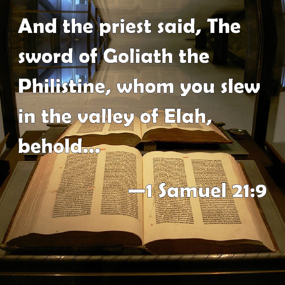 Choose a Background 1 Samuel 21:9 And the priest said, The sword of Goliath the Philistine, whom you slew in the valley of Elah, behold, it is here wrapped in a cloth behind the ephod: if you will take that, take it: for there is no other save that here. And David said, There is none like that; give it me. KJV: And the priest said, The sword of Goliath the Philistine, whom thou slewest in the valley of Elah, behold, it is here wrapped in a cloth behind the ephod: if thou wilt take that, take it: for there is no other save that here. And David said, There is none like that; give it me. DRB: And the priest said: Lo, here is the sword of Goliath the Philistine whom thou slewest in the valley of Terebinth, wrapped up in a cloth behind the ephod: if thou wilt take this, take it, for here is no other but this. And David said: There is none like that, give it me. DBT: And the priest said, The sword of Goliath the Philistine, whom thou slewest in the valley of terebinths, behold, it is here wrapped in a cloth behind the ephod; if thou wilt take that, take it; for there is no other save that here. And David said, There is none like that: give it me. ERV: And the priest said, The sword of Goliath the Philistine, whom thou slowest in the vale of Elah, behold, it is here wrapped in a cloth behind the ephod: if thou wilt take that, take it: for there is no other save that here. And David said, There is none like that; give it me. WBT: And the priest said, The sword of Goliath the Philistine, whom thou slewest in the valley of Elah, behold, it is here wrapped in a cloth behind the ephod: if thou wilt take that, take it: for there is no other save that here. And David said, There is none like that; give it to me. WEB: The priest said, "The sword of Goliath the Philistine, whom you killed in the valley of Elah, behold, it is here wrapped in a cloth behind the ephod. If you will take that, take it; for there is no other except that here." David said, "There is none like that. Give it to me." YLT: And the priest saith, 'The sword of Goliath the Philistine, whom thou didst smite in the valley of Elah, lo, it is wrapped in a garment behind the ephod, if it thou dost take to thyself, take; for there is none other save it in this place.' And David saith, 'There is none like it — give it to me.'Links 1 Samuel 21:9 NIV • 1 Samuel 21:9 NLT • 1 Samuel 21:9 ESV • 1 Samuel 21:9 NASB • 1 Samuel 21:9 KJV • 1 Samuel 21:9 Interlinear • 1 Samuel 21:9 Commentaries • 1 Samuel 21:9 Parallel Texts • 1 Samuel 21:9 Bible Apps • 1 Samuel 21:9 Parallel • Bible Hub |