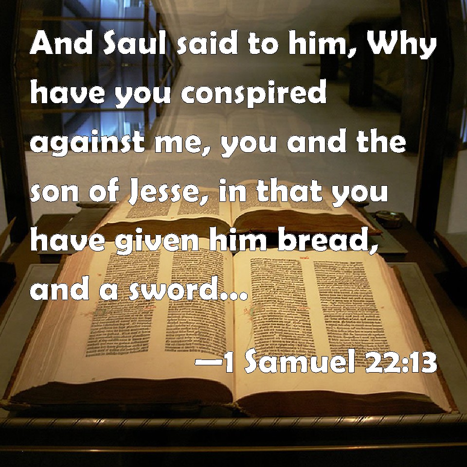 Choose a Background 1 Samuel 22:13 And Saul said to him, Why have you conspired against me, you and the son of Jesse, in that you have given him bread, and a sword, and have inquired of God for him, that he should rise against me, to lie in wait, as at this day? KJV: And Saul said unto him, Why have ye conspired against me, thou and the son of Jesse, in that thou hast given him bread, and a sword, and hast inquired of God for him, that he should rise against me, to lie in wait, as at this day? DRB: And Saul said to him: Why have you conspired against me, thou, and the son of Isai, and thou hast given him bread and a sword, and hast consulted the Lord for him, that he should rise up against me, continuing a traitor to this day. DBT: And Saul said to him, Why have ye conspired against me, thou and the son of Jesse, in that thou hast given him bread, and a sword, and hast inquired of God for him, that he should rise against me as a lier-in-wait, as at this day? ERV: And Saul said unto him, Why have ye conspired against me, thou and the son of Jesse, in that thou hast given him bread, and a sword, and hast inquired of God for him, that he should rise against me, to lie in wait, as at this day? WBT: And Saul said to him, Why have ye conspired against me, thou and the son of Jesse, in that thou hast given him bread, and a sword, and hast inquired of God for him, that he should rise against me, to lie in wait, as at this day? WEB: Saul said to him, "Why have you conspired against me, you and the son of Jesse, in that you have given him bread, and a sword, and have inquired of God for him, that he should rise against me, to lie in wait, as at this day?" YLT: And Saul saith unto him, 'Why have ye conspired against me, thou and the son of Jesse, by thy giving to him bread and a sword, and to ask for him at God, to rise against me, to lie in wait, as at this day?'Links 1 Samuel 22:13 NIV • 1 Samuel 22:13 NLT • 1 Samuel 22:13 ESV • 1 Samuel 22:13 NASB • 1 Samuel 22:13 KJV • 1 Samuel 22:13 Interlinear • 1 Samuel 22:13 Commentaries • 1 Samuel 22:13 Parallel Texts • 1 Samuel 22:13 Bible Apps • 1 Samuel 22:13 Parallel • Bible Hub |