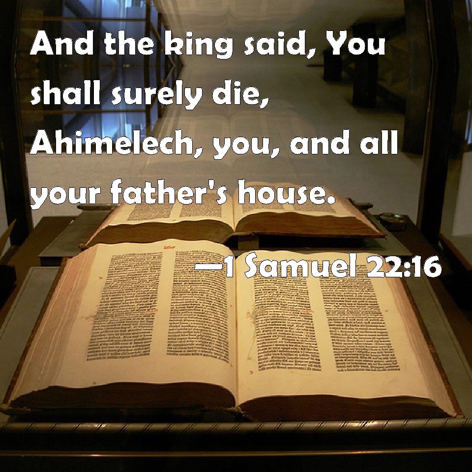 Choose a Background 1 Samuel 22:16 And the king said, You shall surely die, Ahimelech, you, and all your father's house. KJV: And the king said, Thou shalt surely die, Ahimelech, thou, and all thy father's house. DRB: And the king said: Dying thou shalt die, Achimelech, thou and all thy father's house. DBT: And the king said, Thou shalt certainly die, Ahimelech, thou, and all thy father's house. ERV: And the king said, Thou shalt surely die, Ahimelech, thou, and all thy father's house. WBT: And the king said, Thou shalt surely die, Ahimelech, thou, and all thy father's house. WEB: The king said, "You shall surely die, Ahimelech, you, and all your father's house." YLT: And the king saith, 'Thou dost surely die, Ahimelech, thou, and all the house of thy father.'Links 1 Samuel 22:16 NIV • 1 Samuel 22:16 NLT • 1 Samuel 22:16 ESV • 1 Samuel 22:16 NASB • 1 Samuel 22:16 KJV • 1 Samuel 22:16 Interlinear • 1 Samuel 22:16 Commentaries • 1 Samuel 22:16 Parallel Texts • 1 Samuel 22:16 Bible Apps • 1 Samuel 22:16 Parallel • Bible Hub |