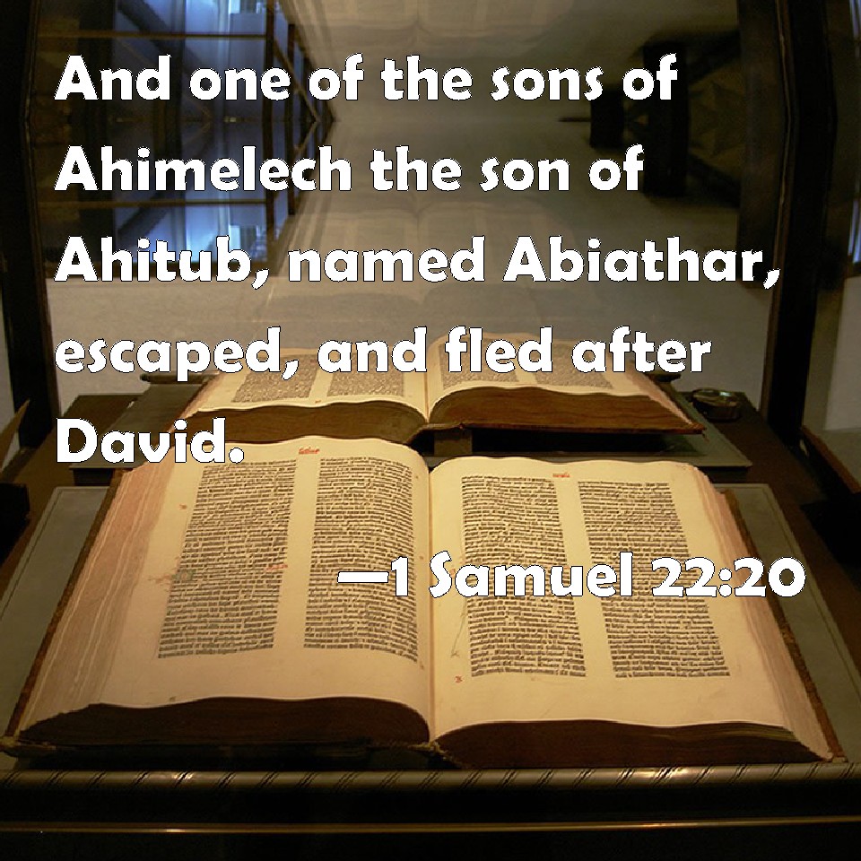 Choose a Background 1 Samuel 22:20 And one of the sons of Ahimelech the son of Ahitub, named Abiathar, escaped, and fled after David. KJV: And one of the sons of Ahimelech the son of Ahitub, named Abiathar, escaped, and fled after David. DRB: But one of the sons of Achimelech the son of Achitob, whose name was Abiathar, escaped, and fled to David, DBT: And one of the sons of Ahimelech the son of Ahitub, named Abiathar, escaped, and fled after David. ERV: And one of the sons of Ahimelech the son of Ahitub, named Abiathar, escaped, and fled after David. WBT: And one of the sons of Ahimelech the son of Ahitub, named Abiathar, escaped, and fled after David. WEB: One of the sons of Ahimelech, the son of Ahitub, named Abiathar, escaped, and fled after David. YLT: And there escapeth one son of Ahimelech, son of Ahitub, and his name is Abiathar, and he fleeth after David,Links 1 Samuel 22:20 NIV • 1 Samuel 22:20 NLT • 1 Samuel 22:20 ESV • 1 Samuel 22:20 NASB • 1 Samuel 22:20 KJV • 1 Samuel 22:20 Interlinear • 1 Samuel 22:20 Commentaries • 1 Samuel 22:20 Parallel Texts • 1 Samuel 22:20 Bible Apps • 1 Samuel 22:20 Parallel • Bible Hub |
