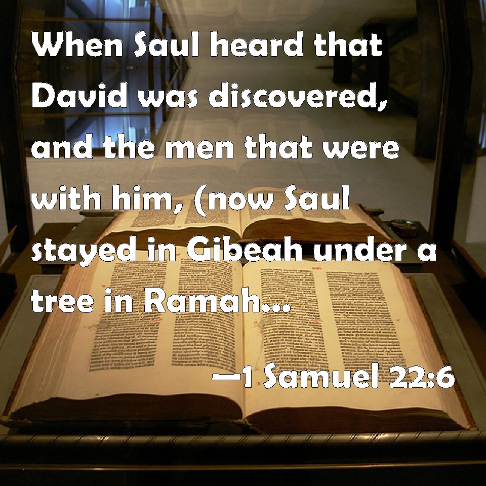 Choose a Background 1 Samuel 22:6 When Saul heard that David was discovered, and the men that were with him, (now Saul stayed in Gibeah under a tree in Ramah, having his spear in his hand, and all his servants were standing about him;) KJV: When Saul heard that David was discovered, and the men that were with him, (now Saul abode in Gibeah under a tree in Ramah, having his spear in his hand, and all his servants were standing about him;) DRB: And Saul heard that David was seen, and the men that were with him. Now whilst Saul abode in Gabaa, and was in the wood, which is by Rama, having his spear in his hand, and all his servants were standing about him, DBT: And Saul heard that David was discovered, and the men that were with him. Now Saul was sitting in Gibeah under the tamarisk upon the height, having his spear in his hand, and all his servants were standing by him. ERV: And Saul heard that David was discovered, and the men that were with him: now Saul was sitting in Gibeah, under the tamarisk tree in Ramah, with his spear in his hand, and all his servants were standing about him. WBT: When Saul heard that David was discovered, and the men that were with him, (now Saul abode in Gibeah under a tree in Ramah, having his spear in his hand, and all his servants were standing about him;) WEB: Saul heard that David was discovered, and the men who were with him. Now Saul was sitting in Gibeah, under the tamarisk tree in Ramah, with his spear in his hand, and all his servants were standing about him. YLT: And Saul heareth that David hath become known, and the men who are with him, and Saul is abiding in Gibeah, under the grove in Ramah, and his spear is in his hand, and all his servants standing by him.Links 1 Samuel 22:6 NIV • 1 Samuel 22:6 NLT • 1 Samuel 22:6 ESV • 1 Samuel 22:6 NASB • 1 Samuel 22:6 KJV • 1 Samuel 22:6 Interlinear • 1 Samuel 22:6 Commentaries • 1 Samuel 22:6 Parallel Texts • 1 Samuel 22:6 Bible Apps • 1 Samuel 22:6 Parallel • Bible Hub |