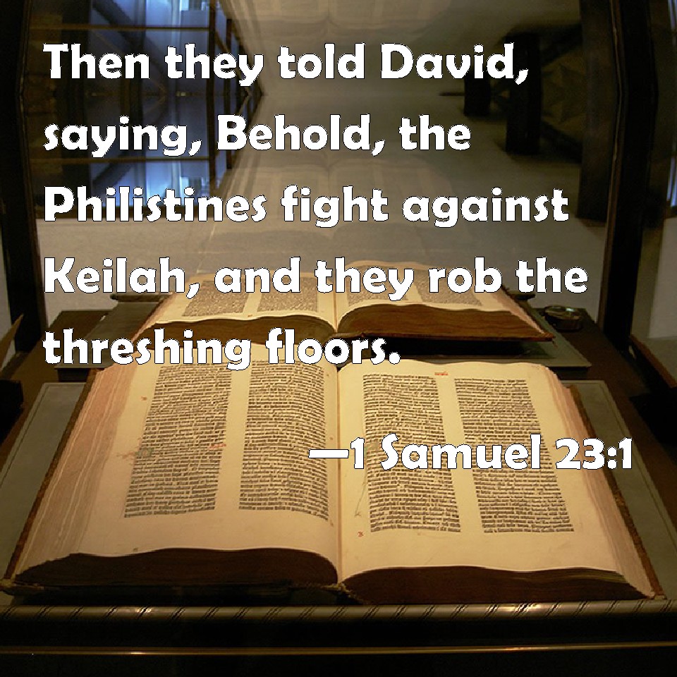 Choose a Background 1 Samuel 23:1 Then they told David, saying, Behold, the Philistines fight against Keilah, and they rob the threshing floors. KJV: Then they told David, saying, Behold, the Philistines fight against Keilah, and they rob the threshingfloors. DRB: And they told David, saying: Behold the Philistines fight against Ceila, and they rob the barns. DBT: And they told David, saying, Behold, the Philistines fight against Keilah, and they rob the threshing-floors. ERV: And they told David, saying, Behold, the Philistines are fighting against Keilah, and they rob the threshing-floors. WBT: Then they told David, saying, Behold, the Philistines fight against Keilah, and they rob the threshing-floors. WEB: David was told, "Behold, the Philistines are fighting against Keilah, and are robbing the threshing floors." YLT: And they declare to David, saying, 'Lo, the Philistines are fighting against Keilah, and they are spoiling the threshing-floors.'Links 1 Samuel 23:1 NIV • 1 Samuel 23:1 NLT • 1 Samuel 23:1 ESV • 1 Samuel 23:1 NASB • 1 Samuel 23:1 KJV • 1 Samuel 23:1 Interlinear • 1 Samuel 23:1 Commentaries • 1 Samuel 23:1 Parallel Texts • 1 Samuel 23:1 Bible Apps • 1 Samuel 23:1 Parallel • Bible Hub |