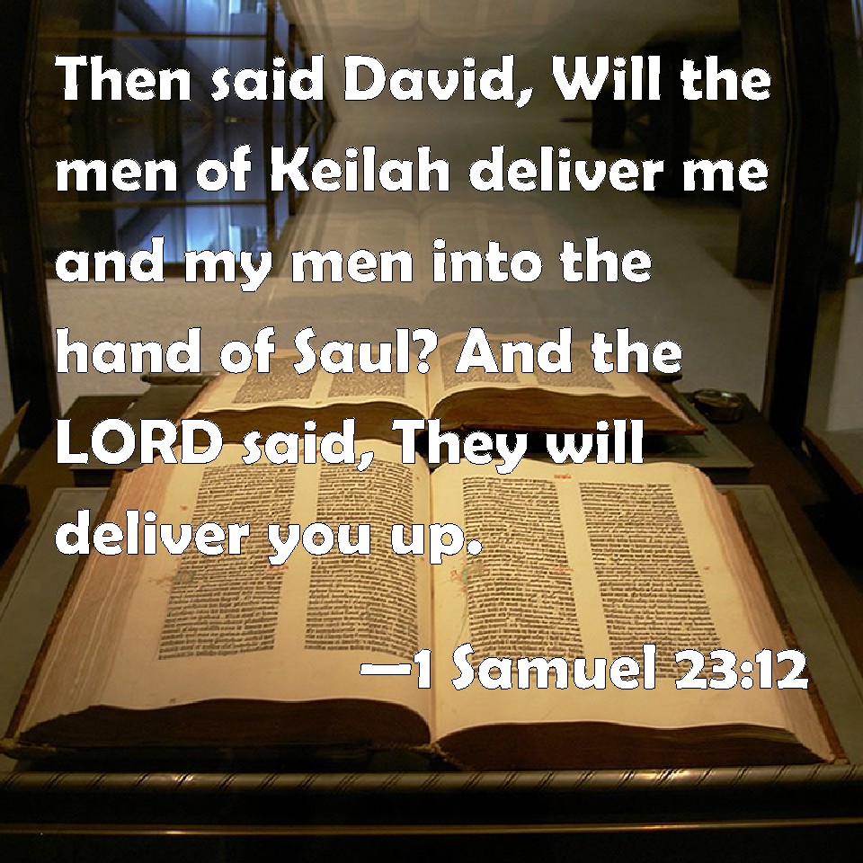 Choose a Background 1 Samuel 23:12 Then said David, Will the men of Keilah deliver me and my men into the hand of Saul? And the LORD said, They will deliver you up. KJV: Then said David, Will the men of Keilah deliver me and my men into the hand of Saul? And the LORD said, They will deliver thee up. DRB: And David said: Will the men of Ceila deliver me, and my men, into the hands of Saul? And the Lord said: They will deliver thee up. DBT: And David said, Will the citizens of Keilah deliver up me and my men into the hand of Saul? And Jehovah said, They will deliver thee up. ERV: Then said David, Will the men of Keilah deliver up me and my men into the hand of Saul? And the LORD said, They will deliver thee up. WBT: Then said David, Will the men of Keilah deliver me and my men into the hand of Saul? And the LORD said, They will deliver thee up. WEB: Then David said, "Will the men of Keilah deliver me and my men into the hand of Saul?" Yahweh said, "They will deliver you up." YLT: And David saith, 'Do the possessors of Keilah shut me up, and my men, into the hand of Saul?' And Jehovah saith, 'They shut thee up.'Links 1 Samuel 23:12 NIV • 1 Samuel 23:12 NLT • 1 Samuel 23:12 ESV • 1 Samuel 23:12 NASB • 1 Samuel 23:12 KJV • 1 Samuel 23:12 Interlinear • 1 Samuel 23:12 Commentaries • 1 Samuel 23:12 Parallel Texts • 1 Samuel 23:12 Bible Apps • 1 Samuel 23:12 Parallel • Bible Hub |