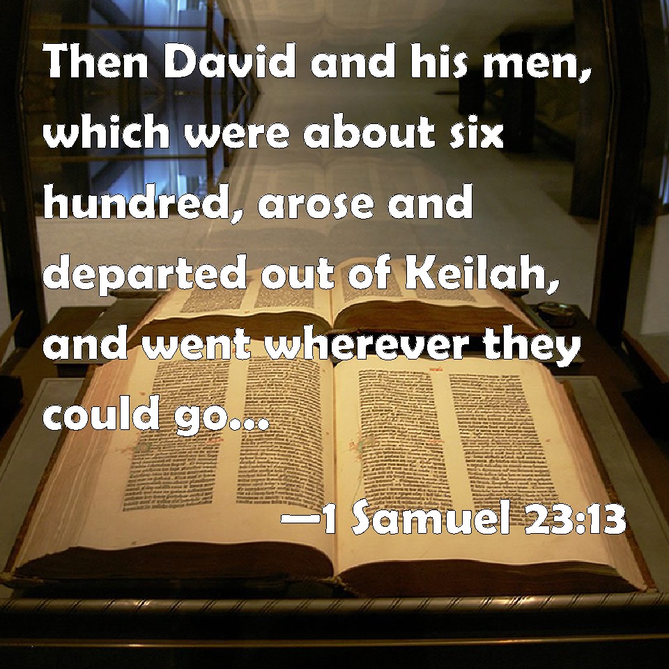 Choose a Background 1 Samuel 23:13 Then David and his men, which were about six hundred, arose and departed out of Keilah, and went wherever they could go. And it was told Saul that David was escaped from Keilah; and he declined to go forth. KJV: Then David and his men, which were about six hundred, arose and departed out of Keilah, and went whithersoever they could go. And it was told Saul that David was escaped from Keilah; and he forbare to go forth. DRB: Then David and his men, who were about six hundred, arose, and departing from Ceila, wandered up and down uncertain where they should stay: and it was told Saul that David was fled from Ceila, and had escaped: wherefore he forbore to go out. DBT: Then David and his men, about six hundred, arose and departed out of Keilah, and went whithersoever they could go. And it was told Saul that David had escaped from Keilah, and he forbore to go forth. ERV: Then David and his men, which were about six hundred, arose and departed out of Keilah, and went whithersoever they could go. And it was told Saul that David was escaped from Keilah; and he forbare to go forth. WBT: Then David and his men who were about six hundred, arose and departed from Keilah, and went whithersoever they could go. And it was told Saul that David had escaped from Keilah: and he forbore to go forth. WEB: Then David and his men, who were about six hundred, arose and departed out of Keilah, and went wherever they could go. It was told Saul that David was escaped from Keilah; and he gave up going there. YLT: And David riseth — and his men — about six hundred men, and they go out from Keilah, and go up and down where they go up and down; and to Saul it hath been declared that David hath escaped from Keilah, and he ceaseth to go out.Links 1 Samuel 23:13 NIV • 1 Samuel 23:13 NLT • 1 Samuel 23:13 ESV • 1 Samuel 23:13 NASB • 1 Samuel 23:13 KJV • 1 Samuel 23:13 Interlinear • 1 Samuel 23:13 Commentaries • 1 Samuel 23:13 Parallel Texts • 1 Samuel 23:13 Bible Apps • 1 Samuel 23:13 Parallel • Bible Hub |