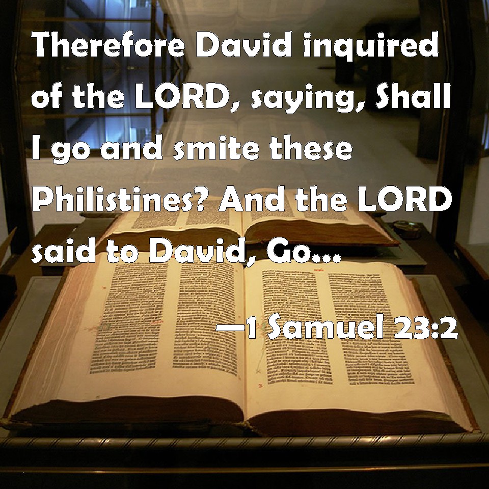 Choose a Background 1 Samuel 23:2 Therefore David inquired of the LORD, saying, Shall I go and smite these Philistines? And the LORD said to David, Go, and smite the Philistines, and save Keilah. KJV: Therefore David inquired of the LORD, saying, Shall I go and smite these Philistines? And the LORD said unto David, Go, and smite the Philistines, and save Keilah. DRB: Therefore David consulted the Lord, saying: Shall I go and smite these Philistines? And the Lord said to David: Go, and thou shalt smite the Philistines, and shalt save Ceila. DBT: And David inquired of Jehovah, saying, Shall I go and smite these Philistines? And Jehovah said to David, Go and smite the Philistines, and save Keilah. ERV: Therefore David inquired of the LORD, saying, Shall I go and smite these Philistines? And the LORD said unto David, Go, and smite the Philistines, and save Keilah. WBT: Therefore David inquired of the LORD, saying, Shall I go and smite these Philistines? And the LORD said to David, Go, and smite the Philistines, and save Keilah. WEB: Therefore David inquired of Yahweh, saying, "Shall I go and strike these Philistines?" Yahweh said to David, "Go strike the Philistines, and save Keilah." YLT: And David asketh at Jehovah, saying, 'Do I go? — and have I smitten among these Philistines?' And Jehovah saith unto David, 'Go, and thou hast smitten among the Philistines, and saved Keilah.'Links 1 Samuel 23:2 NIV • 1 Samuel 23:2 NLT • 1 Samuel 23:2 ESV • 1 Samuel 23:2 NASB • 1 Samuel 23:2 KJV • 1 Samuel 23:2 Interlinear • 1 Samuel 23:2 Commentaries • 1 Samuel 23:2 Parallel Texts • 1 Samuel 23:2 Bible Apps • 1 Samuel 23:2 Parallel • Bible Hub |