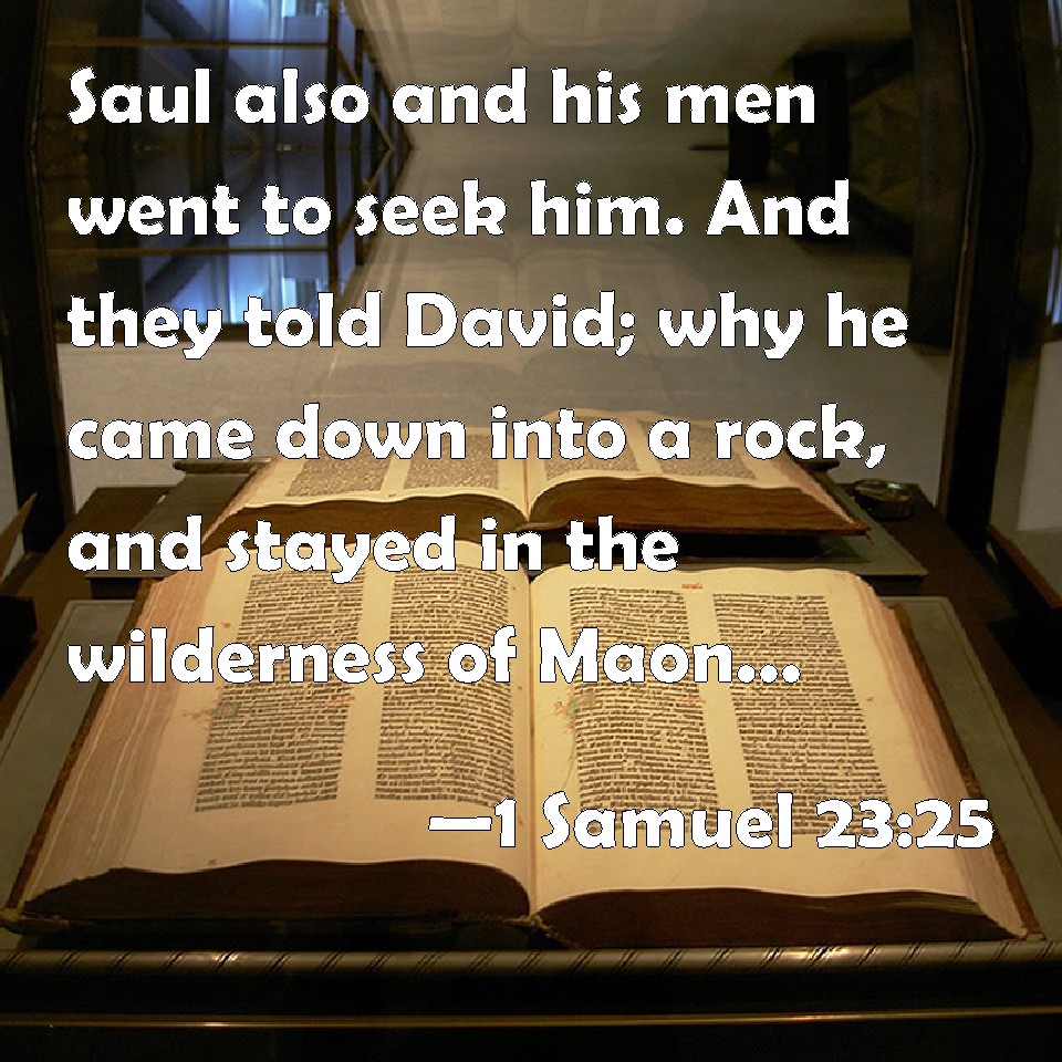 Choose a Background 1 Samuel 23:25 Saul also and his men went to seek him. And they told David; why he came down into a rock, and stayed in the wilderness of Maon. And when Saul heard that, he pursued after David in the wilderness of Maon. KJV: Saul also and his men went to seek him. And they told David: wherefore he came down into a rock, and abode in the wilderness of Maon. And when Saul heard that, he pursued after David in the wilderness of Maon. DRB: Then Saul and his men went to seek him: and it was told David, and forthwith he went down to the rock, and abode in the wilderness of Maon: and when Saul had heard of it he pursued after David in the wilderness of Maon. DBT: And Saul and his men went to seek him. And they told David; and he came down from the rock, and abode in the wilderness of Maon. And Saul heard that, and he pursued after David in the wilderness of Maon. ERV: And Saul and his men went to seek him. And they told David: wherefore he came down to the rock, and abode in the wilderness of Maon. And when Saul heard that, he pursued after David in the wilderness of Maon. WBT: Saul also and his men went to seek him. And they told David: wherefore he came down into a rock, and abode in the wilderness of Maon. And when Saul heard that, he pursued after David in the wilderness of Maon. WEB: Saul and his men went to seek him. When David was told, he went down to the rock, and stayed in the wilderness of Maon. When Saul heard [that], he pursued after David in the wilderness of Maon. YLT: And Saul and his men go to seek, and they declare to David, and he goeth down the rock, and abideth in the wilderness of Maon; and Saul heareth, and pursueth after David to the wilderness of Maon.Links 1 Samuel 23:25 NIV • 1 Samuel 23:25 NLT • 1 Samuel 23:25 ESV • 1 Samuel 23:25 NASB • 1 Samuel 23:25 KJV • 1 Samuel 23:25 Interlinear • 1 Samuel 23:25 Commentaries • 1 Samuel 23:25 Parallel Texts • 1 Samuel 23:25 Bible Apps • 1 Samuel 23:25 Parallel • Bible Hub |