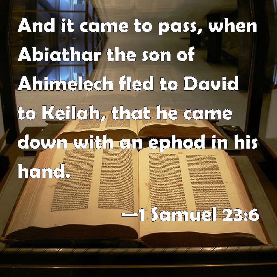Choose a Background 1 Samuel 23:6 And it came to pass, when Abiathar the son of Ahimelech fled to David to Keilah, that he came down with an ephod in his hand. KJV: And it came to pass, when Abiathar the son of Ahimelech fled to David to Keilah, that he came down with an ephod in his hand. DRB: Now at that time, when Abiathar the son of Achimelech fled to David to Ceila, he came down having an ephod with him. DBT: And it came to pass, when Abiathar the son of Ahimelech fled to David to Keilah, he came down with an ephod in his hand. ERV: And it came to pass, when Abiathar the son of Ahimelech fled to David to Keilah, that he came down with an ephod in his hand. WBT: And it came to pass, when Abiathar the son of Ahimelech fled to David to Keilah, that he came down with an ephod in his hand. WEB: It happened, when Abiathar the son of Ahimelech fled to David to Keilah, that he came down with an ephod in his hand. YLT: And it cometh to pass, in the fleeing of Abiathar son of Ahimelech unto David, to Keilah, an ephod came down in his hand.Links 1 Samuel 23:6 NIV • 1 Samuel 23:6 NLT • 1 Samuel 23:6 ESV • 1 Samuel 23:6 NASB • 1 Samuel 23:6 KJV • 1 Samuel 23:6 Interlinear • 1 Samuel 23:6 Commentaries • 1 Samuel 23:6 Parallel Texts • 1 Samuel 23:6 Bible Apps • 1 Samuel 23:6 Parallel • Bible Hub |
