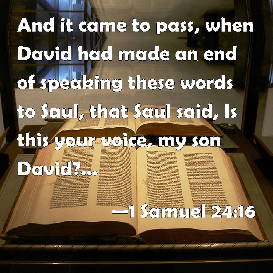 Choose a Background 1 Samuel 24:16 And it came to pass, when David had made an end of speaking these words to Saul, that Saul said, Is this your voice, my son David? And Saul lifted up his voice, and wept. KJV: And it came to pass, when David had made an end of speaking these words unto Saul, that Saul said, Is this thy voice, my son David? And Saul lifted up his voice, and wept. DRB: And when David had made an end of speaking these words to Saul, Saul said: Is this thy voice, my son David? And Saul lifted up his voice, and wept. DBT: And as soon as David had ended speaking these words to Saul, Saul said, Is this thy voice, my son David? And Saul lifted up his voice and wept. ERV: And it came to pass, when David had made an end of speaking these words unto Saul, that Saul said, Is this thy voice, my son David? And Saul lifted up his voice, and wept. WBT: And it came to pass when David had made an end of speaking these words to Saul, that Saul said, Is this thy voice, my son David? And Saul lifted up his voice, and wept. WEB: It came to pass, when David had made an end of speaking these words to Saul, that Saul said, "Is this your voice, my son David?" Saul lifted up his voice, and wept. YLT: And it cometh to pass, when David completeth to speak these words unto Saul, that Saul saith, 'Is this thy voice, my son David?' and Saul lifteth up his voice, and weepeth.Links 1 Samuel 24:16 NIV • 1 Samuel 24:16 NLT • 1 Samuel 24:16 ESV • 1 Samuel 24:16 NASB • 1 Samuel 24:16 KJV • 1 Samuel 24:16 Interlinear • 1 Samuel 24:16 Commentaries • 1 Samuel 24:16 Parallel Texts • 1 Samuel 24:16 Bible Apps • 1 Samuel 24:16 Parallel • Bible Hub |