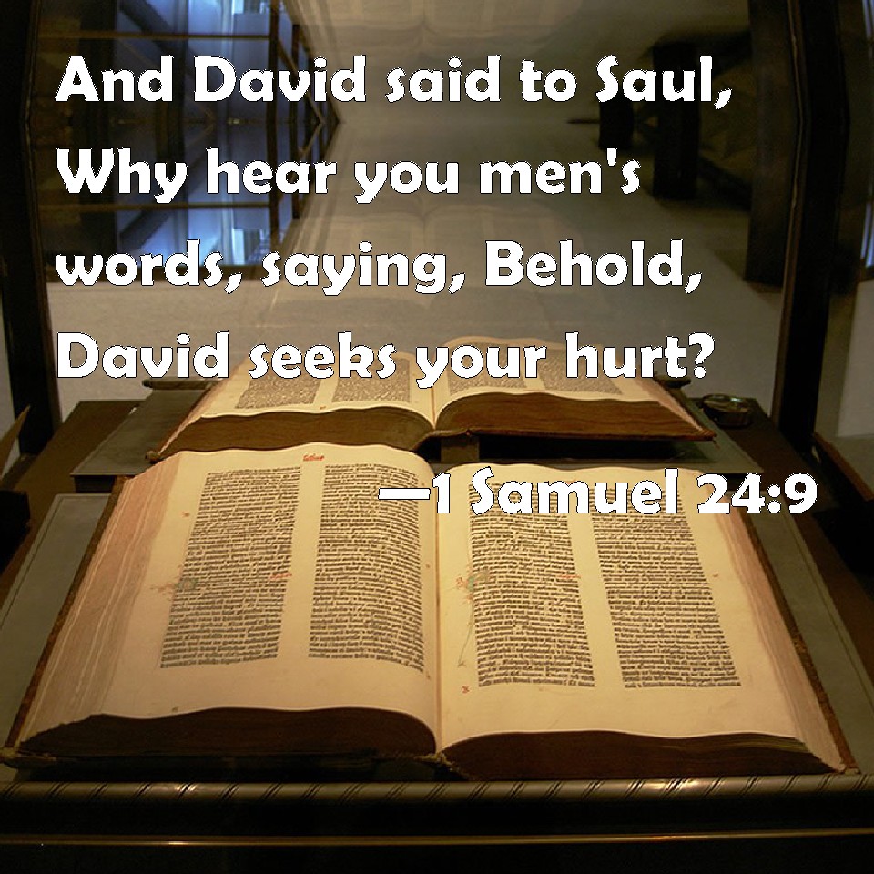 Choose a Background 1 Samuel 24:9 And David said to Saul, Why hear you men's words, saying, Behold, David seeks your hurt? KJV: And David said to Saul, Wherefore hearest thou men's words, saying, Behold, David seeketh thy hurt? DRB: And said to Saul: Why dost thou hear the words of men that say David seeketh thy hurt? DBT: And David said to Saul, Why dost thou listen to words of men, saying, Behold, David seeks thy hurt? ERV: And David said to Saul, Wherefore hearkenest thou to men's words, saying, Behold, David seeketh thy hurt? WBT: And David said to Saul, Why hearest thou men's words, saying, Behold, David seeketh thy hurt? WEB: David said to Saul, "Why do you listen to men's words, saying, 'Behold, David seeks your hurt?' YLT: And David saith to Saul, 'Why dost thou hear the words of man, saying, Lo, David is seeking thine evil?Links 1 Samuel 24:9 NIV • 1 Samuel 24:9 NLT • 1 Samuel 24:9 ESV • 1 Samuel 24:9 NASB • 1 Samuel 24:9 KJV • 1 Samuel 24:9 Interlinear • 1 Samuel 24:9 Commentaries • 1 Samuel 24:9 Parallel Texts • 1 Samuel 24:9 Bible Apps • 1 Samuel 24:9 Parallel • Bible Hub |