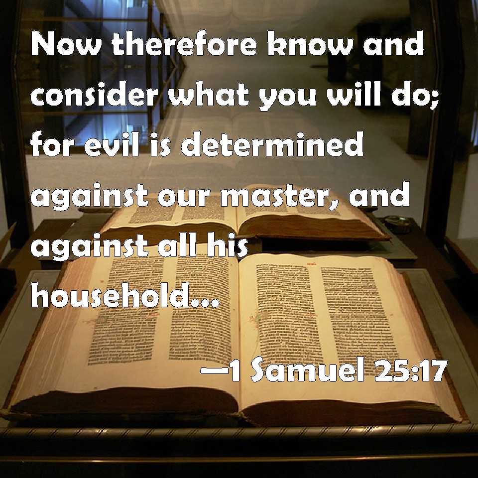 Choose a Background 1 Samuel 25:17 Now therefore know and consider what you will do; for evil is determined against our master, and against all his household: for he is such a son of Belial, that a man cannot speak to him. KJV: Now therefore know and consider what thou wilt do; for evil is determined against our master, and against all his household: for he is such a son of Belial, that a man cannot speak to him. DRB: Wherefore consider, and think what thou hast to do: for evil is determined against thy husband, and against thy house, and he is a son of Belial, so that no man can speak to him. DBT: And now know and consider what thou wilt do, for evil is determined against our master, and against all his household; and he is such a son of Belial, that one cannot speak to him. ERV: Now therefore know and consider what thou wilt do; for evil is determined against our master, and against all his house: for he is such a son of Belial, that one cannot speak to him. WBT: Now therefore know and consider what thou wilt do: for evil is determined against our master, and against all his household: for he is such a son of Belial, that a man cannot speak to him. WEB: Now therefore know and consider what you will do; for evil is determined against our master, and against all his house; for he is such a worthless fellow that one can't speak to him." YLT: And, now, know and consider what thou dost; for evil hath been determined against our lord, and against all his house, and he is too much a son of worthlessness to be spoken to.'Links 1 Samuel 25:17 NIV • 1 Samuel 25:17 NLT • 1 Samuel 25:17 ESV • 1 Samuel 25:17 NASB • 1 Samuel 25:17 KJV • 1 Samuel 25:17 Interlinear • 1 Samuel 25:17 Commentaries • 1 Samuel 25:17 Parallel Texts • 1 Samuel 25:17 Bible Apps • 1 Samuel 25:17 Parallel • Bible Hub |