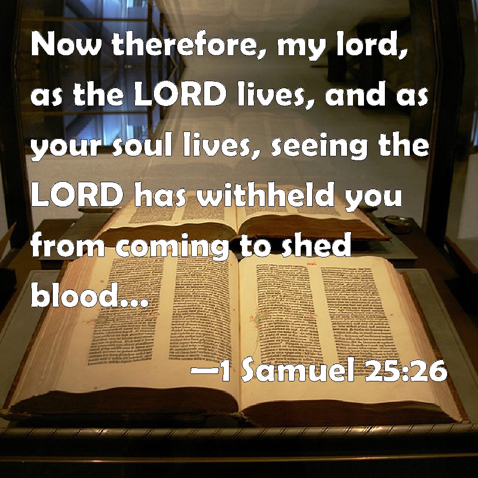 Choose a Background 1 Samuel 25:26 Now therefore, my lord, as the LORD lives, and as your soul lives, seeing the LORD has withheld you from coming to shed blood, and from avenging yourself with your own hand, now let your enemies, and they that seek evil to my lord, be as Nabal. KJV: Now therefore, my lord, as the LORD liveth, and as thy soul liveth, seeing the LORD hath withholden thee from coming to shed blood, and from avenging thyself with thine own hand, now let thine enemies, and they that seek evil to my lord, be as Nabal. DRB: Now therefore, my lord, the Lord liveth, and thy soul liveth, who hath withholden thee from coming to blood, and hath saved thy hand to thee: and now let thy enemies be as Nabal, and all they that seek evil to my lord. DBT: And now, my lord, as Jehovah liveth, and as thy soul liveth, seeing Jehovah has restrained thee from coming with bloodshed, and from avenging thyself with thine own hand, now let thine enemies, and they that seek evil to my lord, be as Nabal. ERV: Now therefore, my lord, as the LORD liveth, and as thy soul liveth, seeing the LORD hath withholden thee from bloodguiltiness, and from avenging thyself with thine own hand, now therefore let thine enemies, and them that seek evil to my lord, be as Nabal. WBT: Now therefore, my lord, as the LORD liveth, and as thy soul liveth, seeing the LORD hath withheld thee from coming to shed blood, and from avenging thyself with thy own hand, now let thy enemies, and they that seek evil to my lord, be as Nabal. WEB: Now therefore, my lord, as Yahweh lives, and as your soul lives, since Yahweh has withheld you from blood guiltiness, and from avenging yourself with your own hand, now therefore let your enemies, and those who seek evil to my lord, be as Nabal. YLT: and now, my lord, Jehovah liveth, and thy soul liveth, in that Jehovah hath withheld thee from coming in with blood, and to save thy hand to thee — now let thine enemies be as Nabal, even those seeking evil unto my lord.Links 1 Samuel 25:26 NIV • 1 Samuel 25:26 NLT • 1 Samuel 25:26 ESV • 1 Samuel 25:26 NASB • 1 Samuel 25:26 KJV • 1 Samuel 25:26 Interlinear • 1 Samuel 25:26 Commentaries • 1 Samuel 25:26 Parallel Texts • 1 Samuel 25:26 Bible Apps • 1 Samuel 25:26 Parallel • Bible Hub |