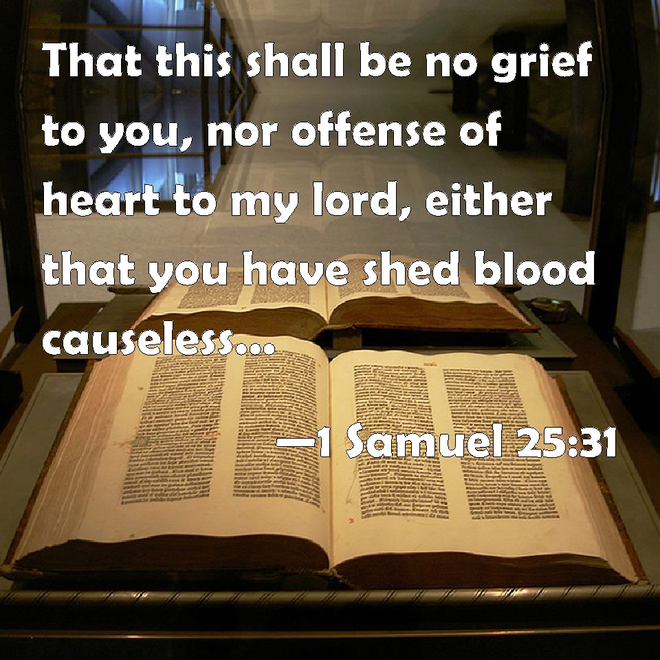Choose a Background 1 Samuel 25:31 That this shall be no grief to you, nor offense of heart to my lord, either that you have shed blood causeless, or that my lord has avenged himself: but when the LORD shall have dealt well with my lord, then remember your handmaid. KJV: That this shall be no grief unto thee, nor offence of heart unto my lord, either that thou hast shed blood causeless, or that my lord hath avenged himself: but when the LORD shall have dealt well with my lord, then remember thine handmaid. DRB: This shall not be an occasion of grief to thee, and a scruple of heart to my lord, that thou hast shed innocent blood, or hast revenged thyself: and when the Lord shall have done well by my lord, thou shalt remember thy handmaid. DBT: that this shall be no stumbling-block to thee, nor offence of heart for my lord, either that thou hast shed blood without cause, or that my lord has avenged himself. And when Jehovah shall deal well with my lord, then remember thy handmaid. ERV: that this shall be no grief unto thee, nor offence of heart unto my lord, either that thou hast shed blood causeless, or that my lord hath avenged himself: and when the LORD shall have dealt well with my lord, then remember thine handmaid. WBT: That this will be no grief to thee, nor offense of heart to my lord, either that thou hast shed blood without cause, or that my lord hath avenged himself: but when the LORD shall have dealt well with my lord, then remember thy handmaid. WEB: that this shall be no grief to you, nor offense of heart to my lord, either that you have shed blood without cause, or that my lord has avenged himself. When Yahweh has dealt well with my lord, then remember your handmaid." YLT: that this is not to thee for a stumbling-block, and for an offence of heart to my lord — either to shed blood for nought, or my lord's restraining himself; and Jehovah hath done good to my lord, and thou hast remembered thy handmaid.'Links 1 Samuel 25:31 NIV • 1 Samuel 25:31 NLT • 1 Samuel 25:31 ESV • 1 Samuel 25:31 NASB • 1 Samuel 25:31 KJV • 1 Samuel 25:31 Interlinear • 1 Samuel 25:31 Commentaries • 1 Samuel 25:31 Parallel Texts • 1 Samuel 25:31 Bible Apps • 1 Samuel 25:31 Parallel • Bible Hub |