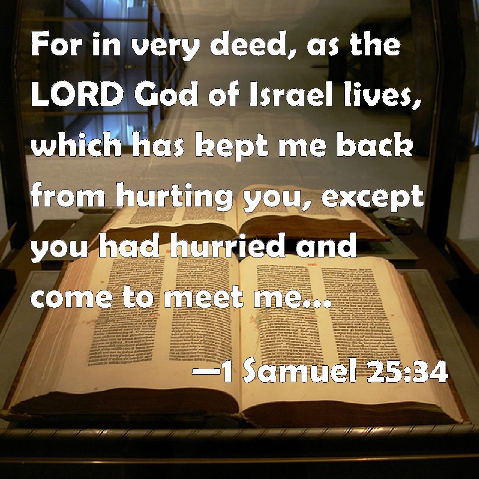 Choose a Background 1 Samuel 25:34 For in very deed, as the LORD God of Israel lives, which has kept me back from hurting you, except you had hurried and come to meet me, surely there had not been left to Nabal by the morning light any that urinates against the wall. KJV: For in very deed, as the LORD God of Israel liveth, which hath kept me back from hurting thee, except thou hadst hasted and come to meet me, surely there had not been left unto Nabal by the morning light any that pisseth against the wall. DRB: Otherwise as the Lord liveth the God of Israel, who hath withholden me from doing thee any evil: if thou hadst not quickly come to meet me, there had not been left to Nabal by the morning light any that pisseth against the wall. DBT: But indeed, as Jehovah the God of Israel liveth, who has restrained me from hurting thee, except thou hadst hasted and come to meet me, there had not been left to Nabal by the morning light any male. ERV: For in very deed, as the LORD, the God of Israel, liveth, which hath withholden me from hurting thee, except thou hadst hasted and come to meet me, surely there had not been left unto Nabal by the morning light so much as one man child. WBT: For in very deed, as the LORD God of Israel liveth, who hath kept me back from hurting thee, except thou hadst hasted and come to meet me, surely there had not been left to Nabal by the morning light any male person. WEB: For indeed, as Yahweh, the God of Israel, lives, who has withheld me from hurting you, unless you had hurried and come to meet me, surely there wouldn't have been left to Nabal by the morning light so much as one who urinates on a wall." YLT: And yet, Jehovah liveth, God of Israel, who hath kept me back from doing evil with thee, for unless thou hadst hasted, and dost come to meet me, surely there had not been left to Nabal till the light of the morning, of those sitting on the wall.'Links 1 Samuel 25:34 NIV • 1 Samuel 25:34 NLT • 1 Samuel 25:34 ESV • 1 Samuel 25:34 NASB • 1 Samuel 25:34 KJV • 1 Samuel 25:34 Interlinear • 1 Samuel 25:34 Commentaries • 1 Samuel 25:34 Parallel Texts • 1 Samuel 25:34 Bible Apps • 1 Samuel 25:34 Parallel • Bible Hub |