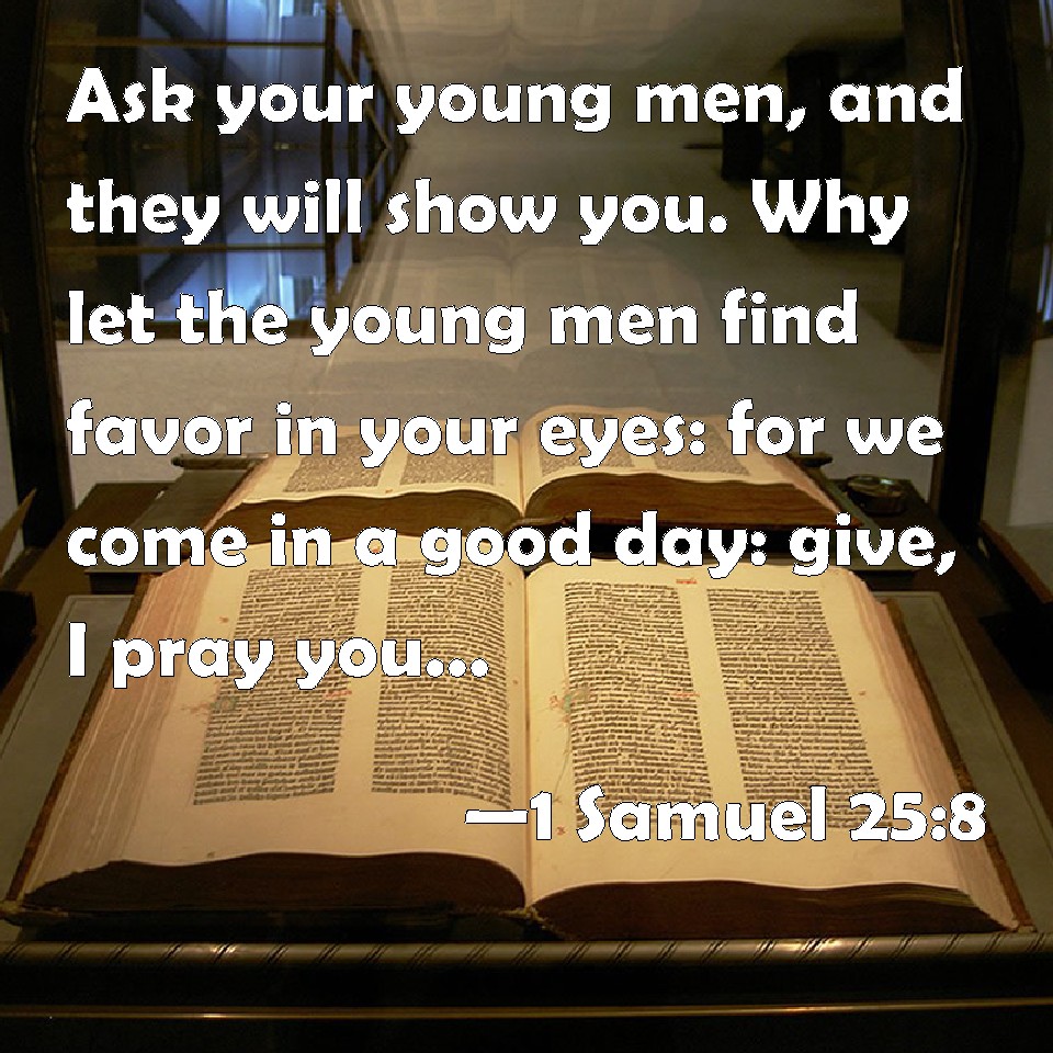 Choose a Background 1 Samuel 25:8 Ask your young men, and they will show you. Why let the young men find favor in your eyes: for we come in a good day: give, I pray you, whatever comes to your hand to your servants, and to your son David. KJV: Ask thy young men, and they will shew thee. Wherefore let the young men find favour in thine eyes: for we come in a good day: give, I pray thee, whatsoever cometh to thine hand unto thy servants, and to thy son David. DRB: Ask thy servants, and they will tell thee. Now therefore let thy servants find favour in thy eyes: for we are come in a good day, whatsoever thy hand shall find give to thy servants, and to thy son David. DBT: Ask thy young men, and they will tell thee. Therefore let the young men find favour in thine eyes; for we come in a good day: give, I pray thee, what thy hand may find to thy servants, and to thy son David. ERV: Ask thy young men, and they will tell thee: wherefore let the young men find favour in thine eyes; for we come in a good day: give, I pray thee, whatsoever cometh to thine hand, unto thy servants, and to thy son David. WBT: Ask thy young men, and they will show thee. Wherefore let the young men find favor in thy eyes: for we come in a good day: give, I pray thee, whatever cometh to thy hand, to thy servants, and to thy son David. WEB: Ask your young men, and they will tell you. Therefore, let the young men find favor in your eyes; for we come in a good day. Please give whatever comes to your hand, to your servants, and to your son David.'" YLT: 'Ask thy young men, and they declare to thee, and the young men find grace in thine eyes, for on a good day we have come; give, I pray thee, that which thy hand findeth, to thy servants, and to thy son, to David.'Links 1 Samuel 25:8 NIV • 1 Samuel 25:8 NLT • 1 Samuel 25:8 ESV • 1 Samuel 25:8 NASB • 1 Samuel 25:8 KJV • 1 Samuel 25:8 Interlinear • 1 Samuel 25:8 Commentaries • 1 Samuel 25:8 Parallel Texts • 1 Samuel 25:8 Bible Apps • 1 Samuel 25:8 Parallel • Bible Hub |