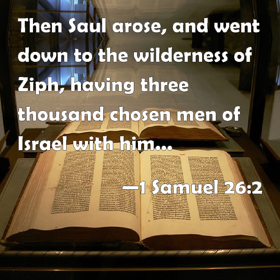 Choose a Background 1 Samuel 26:2 Then Saul arose, and went down to the wilderness of Ziph, having three thousand chosen men of Israel with him, to seek David in the wilderness of Ziph. KJV: Then Saul arose, and went down to the wilderness of Ziph, having three thousand chosen men of Israel with him, to seek David in the wilderness of Ziph. DRB: And Saul arose, and went down to the wilderness of Ziph, having with him three thousand chosen men of Israel, to seek David in the wilderness of Ziph. DBT: And Saul arose, and went down to the wilderness of Ziph, having three thousand chosen men of Israel with him, to seek David in the wilderness of Ziph. ERV: Then Saul arose, and went down to the wilderness of Ziph, having three thousand chosen men of Israel with him, to seek David in the wilderness of Ziph. WBT: Then Saul arose, and went down to the wilderness of Ziph, having three thousand chosen men of Israel with him, to seek David in the wilderness of Ziph. WEB: Then Saul arose, and went down to the wilderness of Ziph, having three thousand chosen men of Israel with him, to seek David in the wilderness of Ziph. YLT: And Saul riseth, and goeth down unto the wilderness of Ziph, and with him three thousand men, chosen ones of Israel, to seek David in the wilderness of Ziph.Links 1 Samuel 26:2 NIV • 1 Samuel 26:2 NLT • 1 Samuel 26:2 ESV • 1 Samuel 26:2 NASB • 1 Samuel 26:2 KJV • 1 Samuel 26:2 Interlinear • 1 Samuel 26:2 Commentaries • 1 Samuel 26:2 Parallel Texts • 1 Samuel 26:2 Bible Apps • 1 Samuel 26:2 Parallel • Bible Hub |