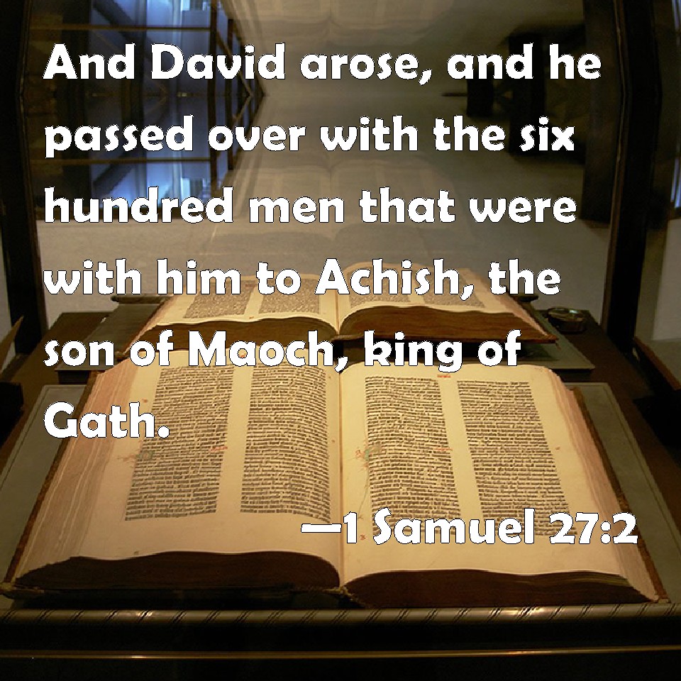 Choose a Background 1 Samuel 27:2 And David arose, and he passed over with the six hundred men that were with him to Achish, the son of Maoch, king of Gath. KJV: And David arose, and he passed over with the six hundred men that were with him unto Achish, the son of Maoch, king of Gath. DRB: And David arose and went away, both he and the six hundred men that were with him, to Achis the son of Maoch, king of Geth. DBT: And David arose and passed over, he and the six hundred men that were with him, to Achish, the son of Maoch, king of Gath. ERV: And David arose, and passed over, he and the six hundred men that were with him, unto Achish the son of Maoch, king of Gath. WBT: And David arose, and he passed over with the six hundred men that were with him to Achish, the son of Maoch, king of Gath. WEB: David arose, and passed over, he and the six hundred men who were with him, to Achish the son of Maoch, king of Gath. YLT: And David riseth, and passeth over, he and six hundred men who are with him, unto Achish son of Maoch king of Gath;Links 1 Samuel 27:2 NIV • 1 Samuel 27:2 NLT • 1 Samuel 27:2 ESV • 1 Samuel 27:2 NASB • 1 Samuel 27:2 KJV • 1 Samuel 27:2 Interlinear • 1 Samuel 27:2 Commentaries • 1 Samuel 27:2 Parallel Texts • 1 Samuel 27:2 Bible Apps • 1 Samuel 27:2 Parallel • Bible Hub |