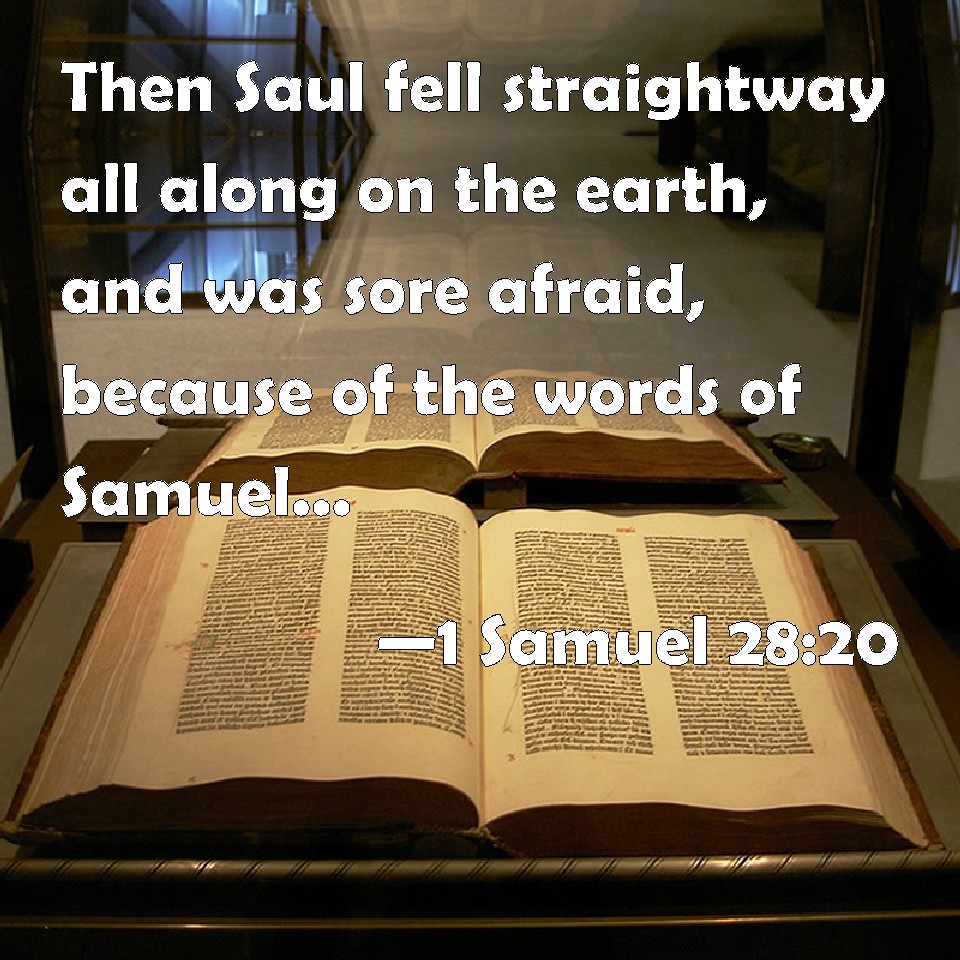 Choose a Background 1 Samuel 28:20 Then Saul fell straightway all along on the earth, and was sore afraid, because of the words of Samuel: and there was no strength in him; for he had eaten no bread all the day, nor all the night. KJV: Then Saul fell straightway all along on the earth, and was sore afraid, because of the words of Samuel: and there was no strength in him; for he had eaten no bread all the day, nor all the night. DRB: And forthwith Saul fell all along on the ground, for he was frightened with the words of Samuel, and there was no strength in him, for he had eaten no bread all that day. DBT: And Saul fell straightway his full length on the earth, and was sore afraid because of the words of Samuel; and there was no strength in him, for he had eaten no bread all the day nor all the night. ERV: Then Saul fell straightway his full length upon the earth, and was sore afraid, because of the words of Samuel: and there was no strength in him; for he had eaten no bread all the day, nor all the night. WBT: Then Saul fell immediately all along on the earth, and was exceedingly afraid, because of the words of Samuel: and there was no strength in him; for he had eaten no bread all the day, nor all the night. WEB: Then Saul fell immediately his full length on the earth, and was terrified, because of the words of Samuel. There was no strength in him; for he had eaten no bread all the day, nor all the night. YLT: And Saul hasteth and falleth — the fulness of his stature — to the earth, and feareth greatly because of the words of Samuel; also power was not in him, for he had not eaten bread all the day, and all the night.Links 1 Samuel 28:20 NIV • 1 Samuel 28:20 NLT • 1 Samuel 28:20 ESV • 1 Samuel 28:20 NASB • 1 Samuel 28:20 KJV • 1 Samuel 28:20 Interlinear • 1 Samuel 28:20 Commentaries • 1 Samuel 28:20 Parallel Texts • 1 Samuel 28:20 Bible Apps • 1 Samuel 28:20 Parallel • Bible Hub |