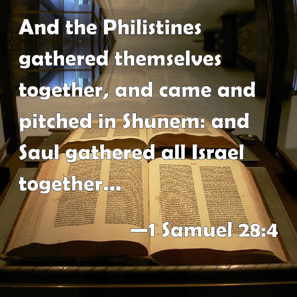 Choose a Background 1 Samuel 28:4 And the Philistines gathered themselves together, and came and pitched in Shunem: and Saul gathered all Israel together, and they pitched in Gilboa. KJV: And the Philistines gathered themselves together, and came and pitched in Shunem: and Saul gathered all Israel together, and they pitched in Gilboa. DRB: And the Philistines were gathered together, and came and camped in Sunam: and Saul also gathered together all Israel, and came to Gelboe. DBT: And the Philistines gathered themselves together, and came and encamped in Shunem; and Saul gathered all Israel together, and they encamped in Gilboa. ERV: And the Philistines gathered themselves together, and came and pitched in Shunem: and Saul gathered all Israel together, and they pitched in Gilboa. WBT: And the Philistines assembled, and came and encamped in Shunem: and Saul collected all Israel, and they encamped in Gilboa. WEB: The Philistines gathered themselves together, and came and encamped in Shunem: and Saul gathered all Israel together, and they encamped in Gilboa. YLT: And the Philistines are gathered, and come in, and encamp in Shunem, and Saul gathereth all Israel, and they encamp in Gilboa,Links 1 Samuel 28:4 NIV • 1 Samuel 28:4 NLT • 1 Samuel 28:4 ESV • 1 Samuel 28:4 NASB • 1 Samuel 28:4 KJV • 1 Samuel 28:4 Interlinear • 1 Samuel 28:4 Commentaries • 1 Samuel 28:4 Parallel Texts • 1 Samuel 28:4 Bible Apps • 1 Samuel 28:4 Parallel • Bible Hub |