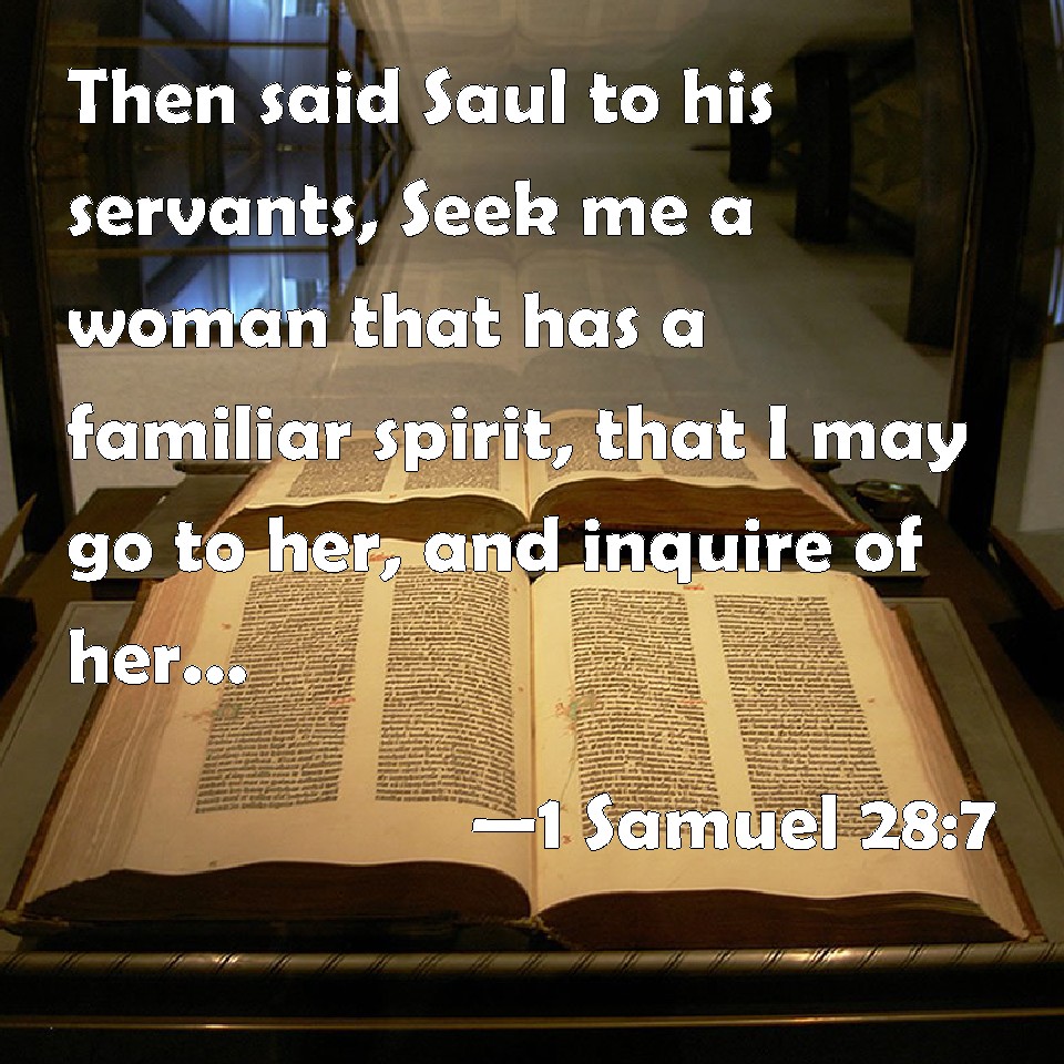 Choose a Background 1 Samuel 28:7 Then said Saul to his servants, Seek me a woman that has a familiar spirit, that I may go to her, and inquire of her. And his servants said to him, Behold, there is a woman that has a familiar spirit at Endor. KJV: Then said Saul unto his servants, Seek me a woman that hath a familiar spirit, that I may go to her, and inquire of her. And his servants said to him, Behold, there is a woman that hath a familiar spirit at Endor. DRB: And Saul said to his servants: Seek me a woman that hath a divining spirit, and I will go to her, and inquire by her. And his servants said to him: There is a woman that hath a divining spirit at Endor. DBT: Then said Saul to his servants, Seek me a woman that has a spirit of Python, that I may go to her and inquire of her. And his servants said to him, Behold, there is a woman who has a spirit of Python at En-dor. ERV: Then said Saul unto his servants, Seek me a woman that hath a familiar spirit, that I may go to her, and inquire of her. And his servants said to him, Behold, there is a woman that hath a familiar spirit at En-dor. WBT: Then said Saul to his servants, seek me a woman that hath a familiar spirit, that I may go to her, and inquire of her. And his servants said to him, Behold, there is a woman that hath a familiar spirit at En-dor. WEB: Then Saul said to his servants, "Seek me a woman who has a familiar spirit, that I may go to her, and inquire of her." His servants said to him, "Behold, there is a woman who has a familiar spirit at Endor." YLT: And Saul saith to his servants, 'Seek for me a woman possessing a familiar spirit, and I go unto her, and inquire of her;' and his servants say unto him, 'Lo, a woman possessing a familiar spirit in En-dor.'Links 1 Samuel 28:7 NIV • 1 Samuel 28:7 NLT • 1 Samuel 28:7 ESV • 1 Samuel 28:7 NASB • 1 Samuel 28:7 KJV • 1 Samuel 28:7 Interlinear • 1 Samuel 28:7 Commentaries • 1 Samuel 28:7 Parallel Texts • 1 Samuel 28:7 Bible Apps • 1 Samuel 28:7 Parallel • Bible Hub |