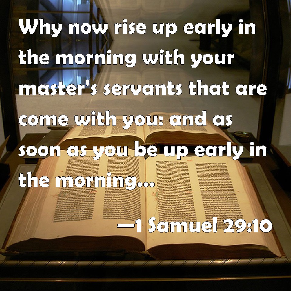 Choose a Background 1 Samuel 29:10 Why now rise up early in the morning with your master's servants that are come with you: and as soon as you be up early in the morning, and have light, depart. KJV: Wherefore now rise up early in the morning with thy master's servants that are come with thee: and as soon as ye be up early in the morning, and have light, depart. DRB: Therefore arise in the morning, thou, and the servants of thy lord, who came with thee: and when you are up before day, and it shall begin to be light, go on your way. DBT: And now rise up early in the morning with thy master's servants that are come with thee; and rise ye early in the morning, and when ye have daylight, depart. ERV: Wherefore now rise up early in the morning with the servants of thy lord that are come with thee: and as soon as ye be up early in the morning, and have light, depart. WBT: Wherefore now rise early in the morning with thy master's servants that are come with thee: and as soon as ye shall have risen early in the morning, and have light, depart. WEB: Therefore now rise up early in the morning with the servants of your lord who have come with you; and as soon as you are up early in the morning, and have light, depart." YLT: and now, rise thou early in the morning, and the servants of thy lord who have come with thee, when ye have risen early in the morning, and have light, then go ye.'Links 1 Samuel 29:10 NIV • 1 Samuel 29:10 NLT • 1 Samuel 29:10 ESV • 1 Samuel 29:10 NASB • 1 Samuel 29:10 KJV • 1 Samuel 29:10 Interlinear • 1 Samuel 29:10 Commentaries • 1 Samuel 29:10 Parallel Texts • 1 Samuel 29:10 Bible Apps • 1 Samuel 29:10 Parallel • Bible Hub |