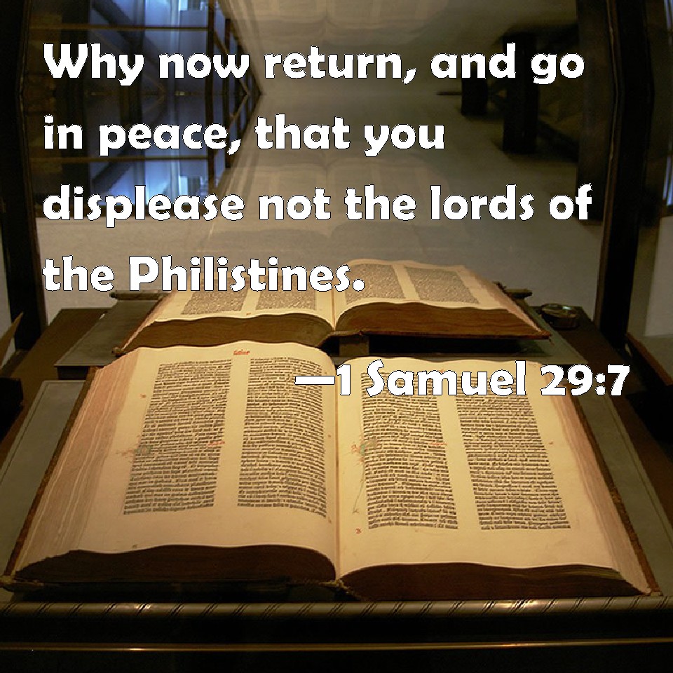 Choose a Background 1 Samuel 29:7 Why now return, and go in peace, that you displease not the lords of the Philistines. KJV: Wherefore now return, and go in peace, that thou displease not the lords of the Philistines. DRB: Return therefore, and go in peace, and offend not the eyes of the princes of the Philistines. DBT: And now return, and go in peace, that thou displease not the lords of the Philistines. ERV: Wherefore now return, and go in peace, that thou displease not the lords of the Philistines. WBT: Therefore now return, and go in peace, that thou displease not the lords of the Philistines. WEB: Therefore now return, and go in peace, that you not displease the lords of the Philistines." YLT: and now, turn back, and go in peace, and thou dost do no evil in the eyes of the princes of the Philistines.'Links 1 Samuel 29:7 NIV • 1 Samuel 29:7 NLT • 1 Samuel 29:7 ESV • 1 Samuel 29:7 NASB • 1 Samuel 29:7 KJV • 1 Samuel 29:7 Interlinear • 1 Samuel 29:7 Commentaries • 1 Samuel 29:7 Parallel Texts • 1 Samuel 29:7 Bible Apps • 1 Samuel 29:7 Parallel • Bible Hub |