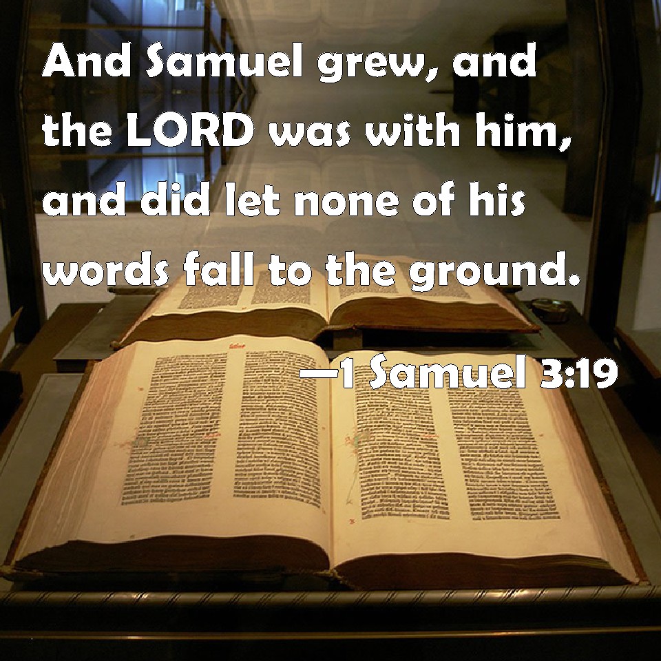 Choose a Background 1 Samuel 3:19 And Samuel grew, and the LORD was with him, and did let none of his words fall to the ground. KJV: And Samuel grew, and the LORD was with him, and did let none of his words fall to the ground. DRB: And Samuel grew, and the Lord was with him, and not one of his words fell to the ground. DBT: And Samuel grew, and Jehovah was with him, and let none of his words fall to the ground. ERV: And Samuel grew, and the LORD was with him, and did let none of his words fall to the ground. WBT: And Samuel grew, and the LORD was with him, and let none of his words fall to the ground. WEB: Samuel grew, and Yahweh was with him, and let none of his words fall to the ground. YLT: And Samuel groweth up, and Jehovah hath been with him, and hath not let fall any of his words to the earth;Links 1 Samuel 3:19 NIV • 1 Samuel 3:19 NLT • 1 Samuel 3:19 ESV • 1 Samuel 3:19 NASB • 1 Samuel 3:19 KJV • 1 Samuel 3:19 Interlinear • 1 Samuel 3:19 Commentaries • 1 Samuel 3:19 Parallel Texts • 1 Samuel 3:19 Bible Apps • 1 Samuel 3:19 Parallel • Bible Hub |