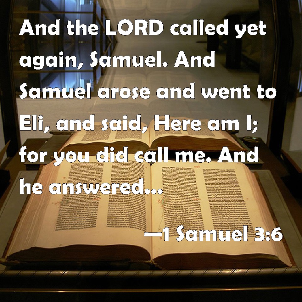 Choose a Background 1 Samuel 3:6 And the LORD called yet again, Samuel. And Samuel arose and went to Eli, and said, Here am I; for you did call me. And he answered, I called not, my son; lie down again. KJV: And the LORD called yet again, Samuel. And Samuel arose and went to Eli, and said, Here am I; for thou didst call me. And he answered, I called not, my son; lie down again. DRB: And the Lord called Samuel again. And Samuel arose and went to Heli, and said: Here am I: for thou calledst me. He answered: I did not call thee, my son: return and sleep. DBT: And Jehovah called again, Samuel! And Samuel arose and went to Eli, and said, Here am I; for thou calledst me. And he said, I did not call, my son: lie down again. ERV: And the LORD called yet again, Samuel. And Samuel arose and went to Eli, and said, Here am I; for thou calledst me. And he answered, I called not, my son; lie down again. WBT: And the LORD called yet again, Samuel. And Samuel arose and went to Eli, and said, Here am I; for thou didst call me. And he answered, I called not, my son; lie down again. WEB: Yahweh called yet again, "Samuel!" Samuel arose and went to Eli, and said, "Here I am; for you called me." He answered, "I didn't call, my son; lie down again." YLT: And Jehovah addeth to call again Samuel, and Samuel riseth and goeth unto Eli, and saith, 'Here am I, for thou hast called for me;' and he saith, 'I have not called, my son, turn back, lie down.'Links 1 Samuel 3:6 NIV • 1 Samuel 3:6 NLT • 1 Samuel 3:6 ESV • 1 Samuel 3:6 NASB • 1 Samuel 3:6 KJV • 1 Samuel 3:6 Interlinear • 1 Samuel 3:6 Commentaries • 1 Samuel 3:6 Parallel Texts • 1 Samuel 3:6 Bible Apps • 1 Samuel 3:6 Parallel • Bible Hub |