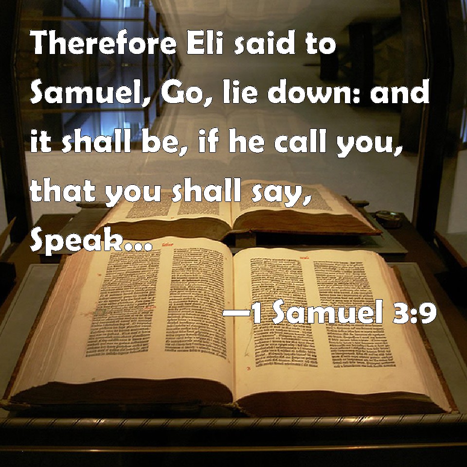 Choose a Background 1 Samuel 3:9 Therefore Eli said to Samuel, Go, lie down: and it shall be, if he call you, that you shall say, Speak, LORD; for your servant hears. So Samuel went and lay down in his place. KJV: Therefore Eli said unto Samuel, Go, lie down: and it shall be, if he call thee, that thou shalt say, Speak, LORD; for thy servant heareth. So Samuel went and lay down in his place. DRB: And said: Here am I: for thou didst call me. Then Heli understood that the Lord called the child, and he said to Samuel: Go, and sleep: and if he shall call thee any more, thou shalt say: Speak, Lord, for thy servant heareth. So Samuel went and slept in his place. DBT: And Eli said to Samuel, Go, lie down; and it shall be, if he call thee, that thou shalt say, Speak, Jehovah, for thy servant heareth. So Samuel went and lay down in his place. ERV: Therefore Eli said unto Samuel, Go, lie down: and it shall be, if he call thee, that thou shalt say, Speak, LORD; for thy servant heareth. So Samuel went and lay down in his place. WBT: Therefore Eli said to Samuel, Go, lie down: and it shall be, if he should call thee, that thou shalt say, Speak, LORD; for thy servant heareth. So Samuel went and lay down in his place. WEB: Therefore Eli said to Samuel, "Go, lie down: and it shall be, if he calls you, that you shall say, 'Speak, Yahweh; for your servant hears.'" So Samuel went and lay down in his place. YLT: And Eli saith to Samuel, 'Go, lie down, and it hath been, if He doth call unto thee, that thou hast said, Speak, Jehovah, for Thy servant is hearing;' and Samuel goeth and lieth down in his place.Links 1 Samuel 3:9 NIV • 1 Samuel 3:9 NLT • 1 Samuel 3:9 ESV • 1 Samuel 3:9 NASB • 1 Samuel 3:9 KJV • 1 Samuel 3:9 Interlinear • 1 Samuel 3:9 Commentaries • 1 Samuel 3:9 Parallel Texts • 1 Samuel 3:9 Bible Apps • 1 Samuel 3:9 Parallel • Bible Hub |