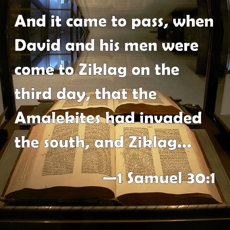 Choose a Background 1 Samuel 30:1 And it came to pass, when David and his men were come to Ziklag on the third day, that the Amalekites had invaded the south, and Ziklag, and smitten Ziklag, and burned it with fire; KJV: And it came to pass, when David and his men were come to Ziklag on the third day, that the Amalekites had invaded the south, and Ziklag, and smitten Ziklag, and burned it with fire; DRB: Now when David and his men were come to Siceleg on the third day, the Amalecites had made an invasion on the south side upon Siceleg, and had smitten Siceleg, and burnt it with fire. DBT: And it came to pass, when David and his men came to Ziklag on the third day, that the Amalekites had made a raid upon the south, and upon Ziklag, and smitten Ziklag and burned it with fire; ERV: And it came to pass, when David and his men were come to Ziklag on the third day, that the Amalekites had made a raid upon the South, and upon Ziklag, and had smitten Ziklag, and burned it with fire; WBT: And it came to pass, when David and his men were come to Ziklag on the third day, that the Amalekites had invaded the south, and Ziklag, and smitten Ziklag, and burned it with fire; WEB: It happened, when David and his men were come to Ziklag on the third day, that the Amalekites had made a raid on the South, and on Ziklag, and had struck Ziklag, and burned it with fire, YLT: And it cometh to pass, in the coming in of David and his men to Ziklag, on the third day, that the Amalekites have pushed unto the south, and unto Ziklag, and smite Ziklag, and burn it with fire,Links 1 Samuel 30:1 NIV • 1 Samuel 30:1 NLT • 1 Samuel 30:1 ESV • 1 Samuel 30:1 NASB • 1 Samuel 30:1 KJV • 1 Samuel 30:1 Interlinear • 1 Samuel 30:1 Commentaries • 1 Samuel 30:1 Parallel Texts • 1 Samuel 30:1 Bible Apps • 1 Samuel 30:1 Parallel • Bible Hub |