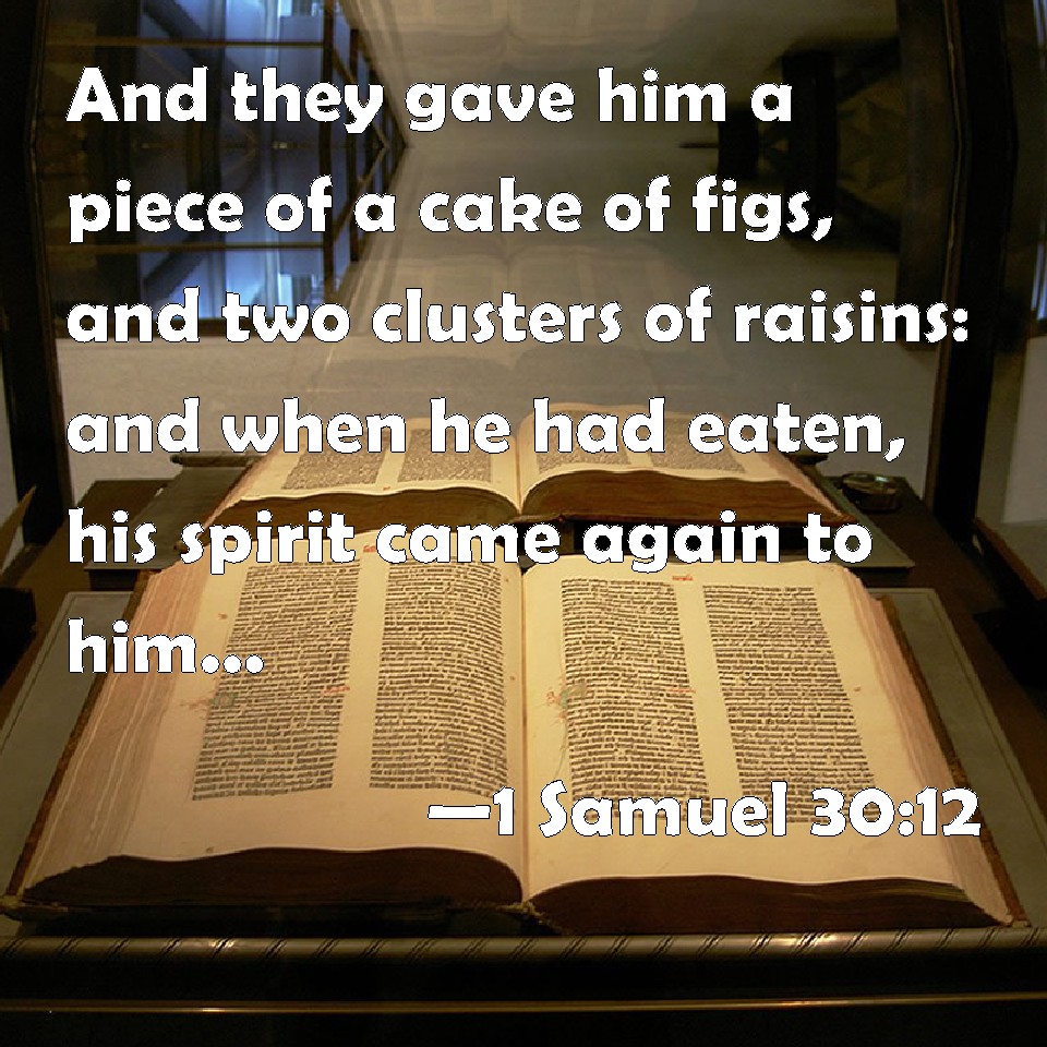 Choose a Background 1 Samuel 30:12 And they gave him a piece of a cake of figs, and two clusters of raisins: and when he had eaten, his spirit came again to him: for he had eaten no bread, nor drunk any water, three days and three nights. KJV: And they gave him a piece of a cake of figs, and two clusters of raisins: and when he had eaten, his spirit came again to him: for he had eaten no bread, nor drunk any water, three days and three nights. DRB: As also a piece of a cake of figs, and two bunches of raisins. And when he had eaten them his spirit returned, and he was refreshed: for he had not eaten bread, nor drunk water three days, and three nights. DBT: and gave him a piece of fig-cake and two raisin-cakes, and he ate, and his spirit came again to him; for he had eaten no bread, nor drunk any water, for three days and three nights. ERV: And they gave him a piece of a cake of figs, and two clusters of raisins; and when he had eaten, his spirit came again to him: for he had eaten no bread, nor drunk any water, three days and three nights. WBT: And they gave him a piece of a cake of figs, and two clusters of raisins: and when he had eaten, his spirit came again to him: for he had eaten no bread, nor drank any water, three days and three nights. WEB: They gave him a piece of a cake of figs, and two clusters of raisins. when he had eaten, his spirit came again to him; for he had eaten no bread, nor drunk any water, three days and three nights. YLT: and give to him a piece of a bunch of dried figs, and two bunches of raisins, and he eateth, and his spirit returneth unto him, for he hath not eaten bread nor drunk water three days and three nights.Links 1 Samuel 30:12 NIV • 1 Samuel 30:12 NLT • 1 Samuel 30:12 ESV • 1 Samuel 30:12 NASB • 1 Samuel 30:12 KJV • 1 Samuel 30:12 Interlinear • 1 Samuel 30:12 Commentaries • 1 Samuel 30:12 Parallel Texts • 1 Samuel 30:12 Bible Apps • 1 Samuel 30:12 Parallel • Bible Hub |