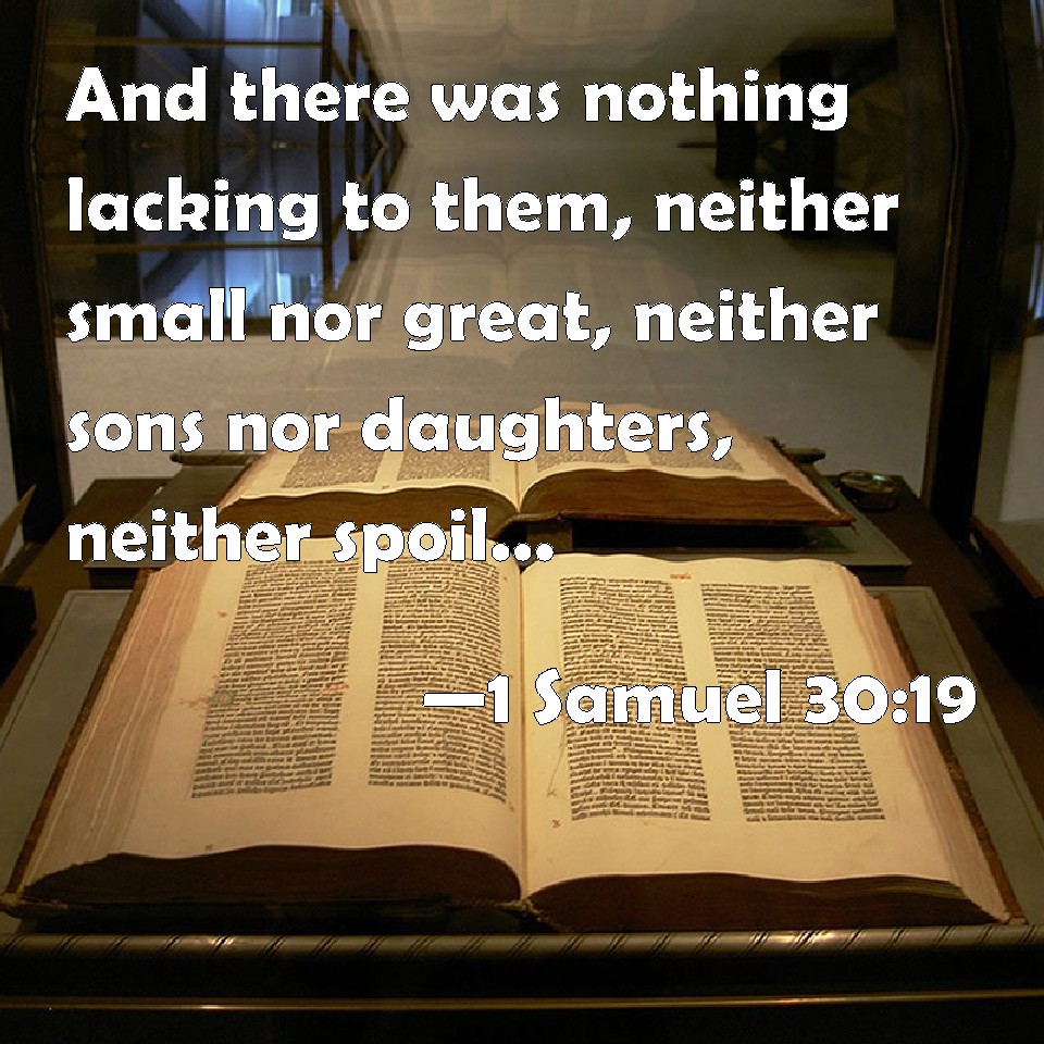 Choose a Background 1 Samuel 30:19 And there was nothing lacking to them, neither small nor great, neither sons nor daughters, neither spoil, nor any thing that they had taken to them: David recovered all. KJV: And there was nothing lacking to them, neither small nor great, neither sons nor daughters, neither spoil, nor any thing that they had taken to them: David recovered all. DRB: And there was nothing missing small or great, neither of their sons or their daughters, nor of the spoils, and whatsoever they had taken: David recovered all. DBT: And there was nothing missed by them, neither small nor great, neither sons nor daughters, neither spoil nor anything that they had taken: David brought all back. ERV: And there was nothing lacking to them, neither small nor great, neither sons nor daughters, neither spoil, nor any thing that they had taken to them: David brought back all. WBT: And there was nothing lacking to them, neither small nor great, neither sons nor daughters, neither spoil, nor any thing that they had taken to them: David recovered all. WEB: There was nothing lacking to them, neither small nor great, neither sons nor daughters, neither spoil, nor anything that they had taken to them. David brought back all. YLT: And there hath not lacked to them anything, from small unto great, and unto sons and daughters, and from the spoil, even unto all that they had taken to themselves, the whole hath David brought back,Links 1 Samuel 30:19 NIV • 1 Samuel 30:19 NLT • 1 Samuel 30:19 ESV • 1 Samuel 30:19 NASB • 1 Samuel 30:19 KJV • 1 Samuel 30:19 Interlinear • 1 Samuel 30:19 Commentaries • 1 Samuel 30:19 Parallel Texts • 1 Samuel 30:19 Bible Apps • 1 Samuel 30:19 Parallel • Bible Hub |