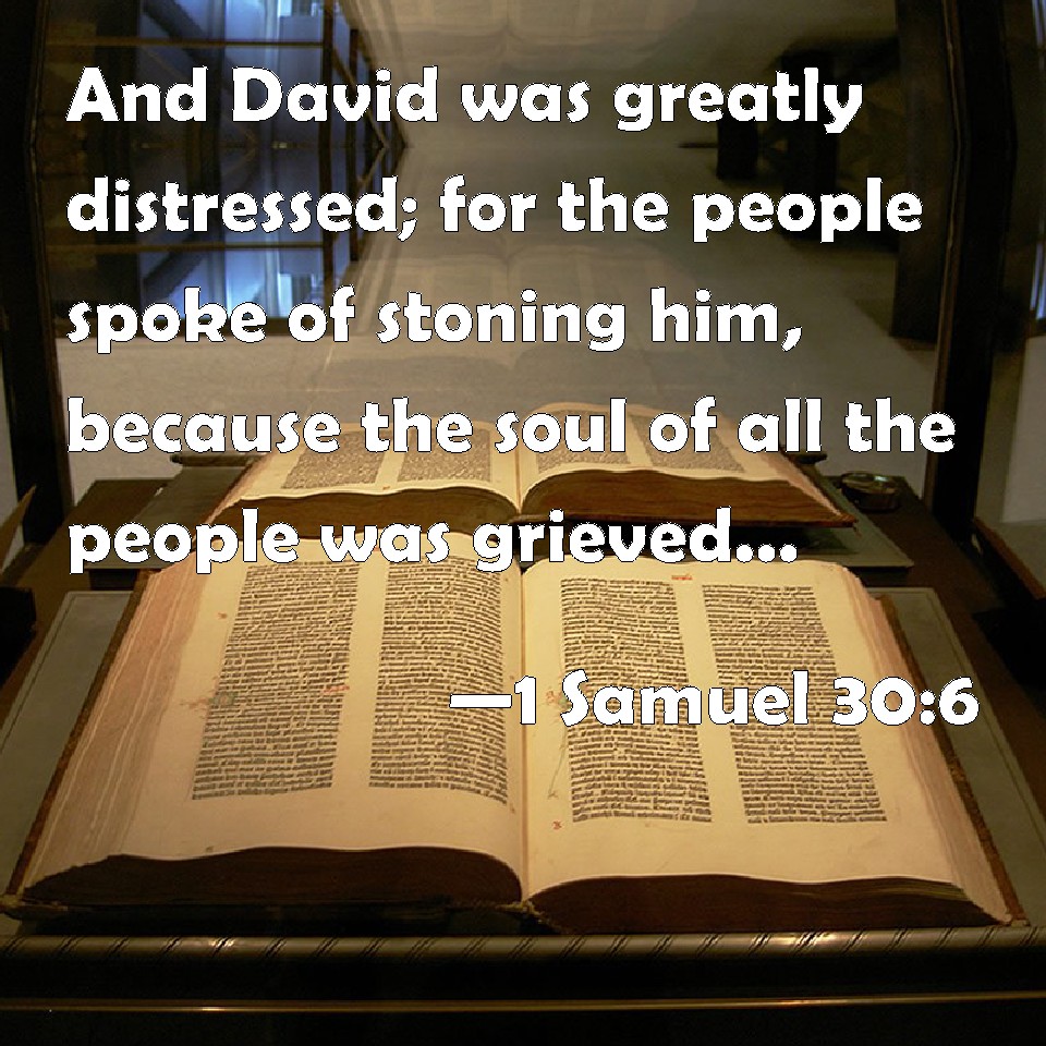 Choose a Background 1 Samuel 30:6 And David was greatly distressed; for the people spoke of stoning him, because the soul of all the people was grieved, every man for his sons and for his daughters: but David encouraged himself in the LORD his God. KJV: And David was greatly distressed; for the people spake of stoning him, because the soul of all the people was grieved, every man for his sons and for his daughters: but David encouraged himself in the LORD his God. DRB: And David was greatly afflicted: for the people had a mind to stone him, for the soul of every man was bitterly grieved for his sons, and daughters: but David took courage in the Lord his God. DBT: And David was greatly distressed; for the people spoke of stoning him; for the soul of all the people was embittered, every man because of his sons and because of his daughters; but David strengthened himself in Jehovah his God. ERV: And David was greatly distressed; for the people spake of stoning him, because the soul of all the people was grieved, every man for his sons and for his daughters: but David strengthened himself in the LORD his God. WBT: And David was greatly distressed: for the people spoke of stoning him, because the soul of all the people was grieved, every man for his sons, and for his daughters: but David encouraged himself in the LORD his God. WEB: David was greatly distressed; for the people spoke of stoning him, because the soul of all the people was grieved, every man for his sons and for his daughters: but David strengthened himself in Yahweh his God. YLT: and David hath great distress, for the people have said to stone him, for the soul of all the people hath been bitter, each for his sons and for his daughters; and David doth strengthen himself in Jehovah his God.Links 1 Samuel 30:6 NIV • 1 Samuel 30:6 NLT • 1 Samuel 30:6 ESV • 1 Samuel 30:6 NASB • 1 Samuel 30:6 KJV • 1 Samuel 30:6 Interlinear • 1 Samuel 30:6 Commentaries • 1 Samuel 30:6 Parallel Texts • 1 Samuel 30:6 Bible Apps • 1 Samuel 30:6 Parallel • Bible Hub |