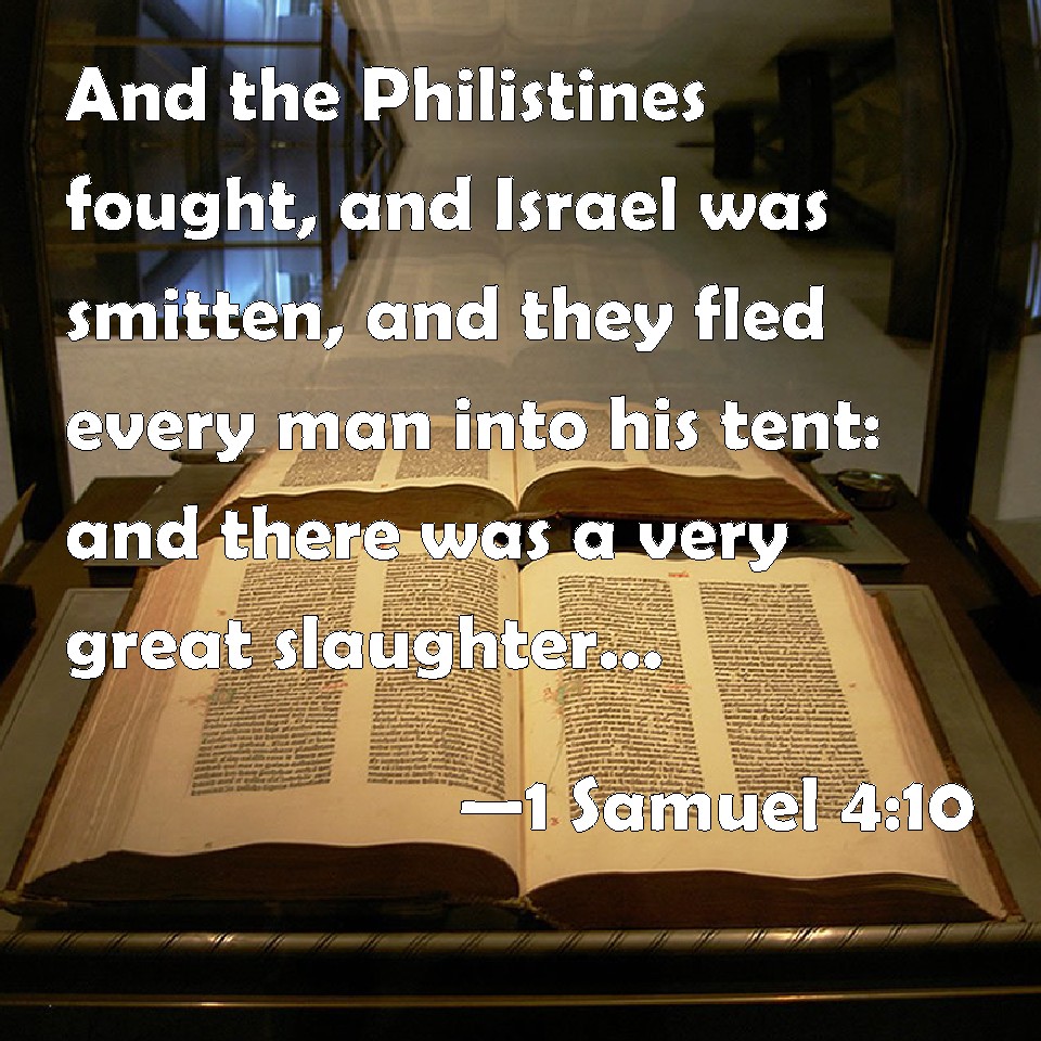 Choose a Background 1 Samuel 4:10 And the Philistines fought, and Israel was smitten, and they fled every man into his tent: and there was a very great slaughter; for there fell of Israel thirty thousand footmen. KJV: And the Philistines fought, and Israel was smitten, and they fled every man into his tent: and there was a very great slaughter; for there fell of Israel thirty thousand footmen. DRB: So the Philistines fought, and Israel was overthrown, and every man fled to his own dwelling: and there was an exceeding great slaughter; for there fell of Israel thirty thousand footmen. DBT: And the Philistines fought, and Israel was routed, and they fled every man to his tent; and there was a very great slaughter, and there fell of Israel thirty thousand footmen. ERV: And the Philistines fought, and Israel was smitten, and they fled every man to his tent: and there was a very great slaughter; for there fell of Israel thirty thousand footmen. WBT: And the Philistines fought, and Israel was smitten, and they fled every man into his tent: and there was a very great slaughter, for there fell of Israel thirty thousand footmen. WEB: The Philistines fought, and Israel was struck, and they fled every man to his tent: and there was a very great slaughter; for there fell of Israel thirty thousand footmen. YLT: And the Philistines fight, and Israel is smitten, and they flee each to his tents, and the blow is very great, and there fall of Israel thirty thousand footmen;Links 1 Samuel 4:10 NIV • 1 Samuel 4:10 NLT • 1 Samuel 4:10 ESV • 1 Samuel 4:10 NASB • 1 Samuel 4:10 KJV • 1 Samuel 4:10 Interlinear • 1 Samuel 4:10 Commentaries • 1 Samuel 4:10 Parallel Texts • 1 Samuel 4:10 Bible Apps • 1 Samuel 4:10 Parallel • Bible Hub |