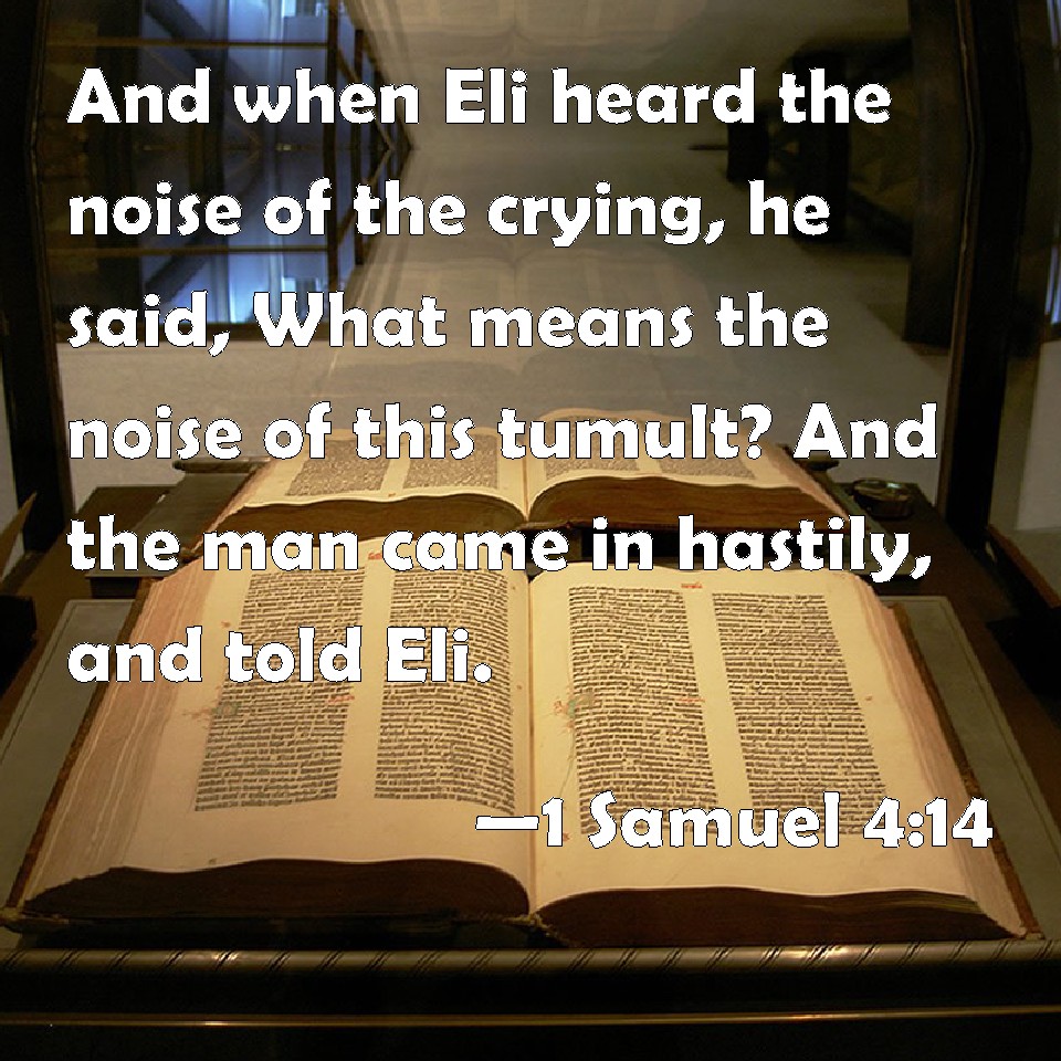 Choose a Background 1 Samuel 4:14 And when Eli heard the noise of the crying, he said, What means the noise of this tumult? And the man came in hastily, and told Eli. KJV: And when Eli heard the noise of the crying, he said, What meaneth the noise of this tumult? And the man came in hastily, and told Eli. DRB: And Heli heard the noise of the cry, and he said: What meaneth the noise of this uproar? But he made haste, and came, and told Heli. DBT: And Eli heard the noise of the crying, and said, What is the noise of this tumult? And the man came hastily, and told Eli. ERV: And when Eli heard the noise of the crying, he said, What meaneth the noise of this tumult? And the man hasted and came and told Eli. WBT: And when Eli heard the noise of the crying, he said, What meaneth the noise of this tumult? And the man came in hastily, and told Eli. WEB: When Eli heard the noise of the crying, he said, "What does the noise of this tumult mean?" The man hurried, and came and told Eli. YLT: And Eli heareth the noise of the cry, and saith, 'What — the noise of this tumult!' And the man hasted, and cometh in, and declareth to Eli.Links 1 Samuel 4:14 NIV • 1 Samuel 4:14 NLT • 1 Samuel 4:14 ESV • 1 Samuel 4:14 NASB • 1 Samuel 4:14 KJV • 1 Samuel 4:14 Interlinear • 1 Samuel 4:14 Commentaries • 1 Samuel 4:14 Parallel Texts • 1 Samuel 4:14 Bible Apps • 1 Samuel 4:14 Parallel • Bible Hub |