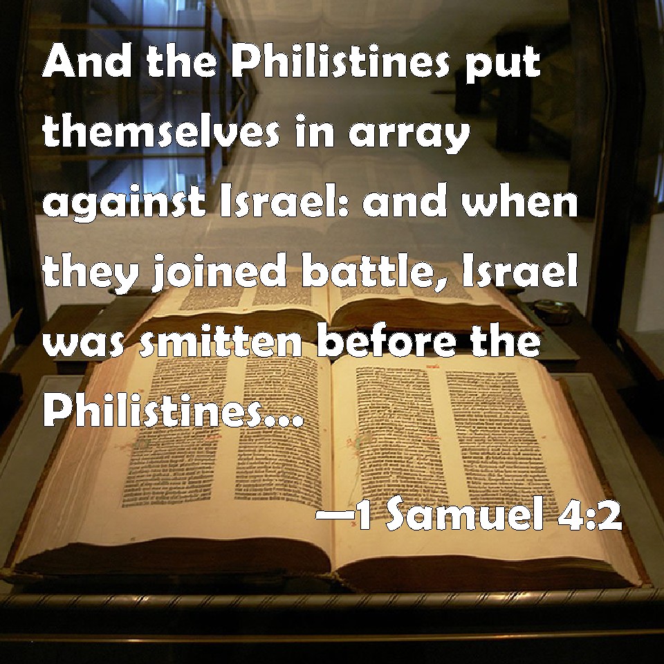 Choose a Background 1 Samuel 4:2 And the Philistines put themselves in array against Israel: and when they joined battle, Israel was smitten before the Philistines: and they slew of the army in the field about four thousand men. KJV: And the Philistines put themselves in array against Israel: and when they joined battle, Israel was smitten before the Philistines: and they slew of the army in the field about four thousand men. DRB: And put their army in array against Israel. And when they had joined battle, Israel turned their backs to the Philistines, and there was slain in that fight here and there in the fields about four thousand men. DBT: And the Philistines put themselves in array against Israel; and the battle spread, and Israel was routed before the Philistines; and they slew in battle array in the field about four thousand men. ERV: And the Philistines put themselves in array against Israel: and when they joined battle, Israel was smitten before the Philistines: and they slew of the army in the field about four thousand men. WBT: And the Philistines put themselves in array against Israel: and when they joined battle, Israel was smitten before the Philistines: and they slew of the army in the field about four thousand men. WEB: The Philistines put themselves in array against Israel: and when they joined battle, Israel was struck before the Philistines; and they killed of the army in the field about four thousand men. YLT: and the Philistines set themselves in array to meet Israel, and the battle spreadeth itself, and Israel is smitten before the Philistines, and they smite among the ranks in the field about four thousand men.Links 1 Samuel 4:2 NIV • 1 Samuel 4:2 NLT • 1 Samuel 4:2 ESV • 1 Samuel 4:2 NASB • 1 Samuel 4:2 KJV • 1 Samuel 4:2 Interlinear • 1 Samuel 4:2 Commentaries • 1 Samuel 4:2 Parallel Texts • 1 Samuel 4:2 Bible Apps • 1 Samuel 4:2 Parallel • Bible Hub |