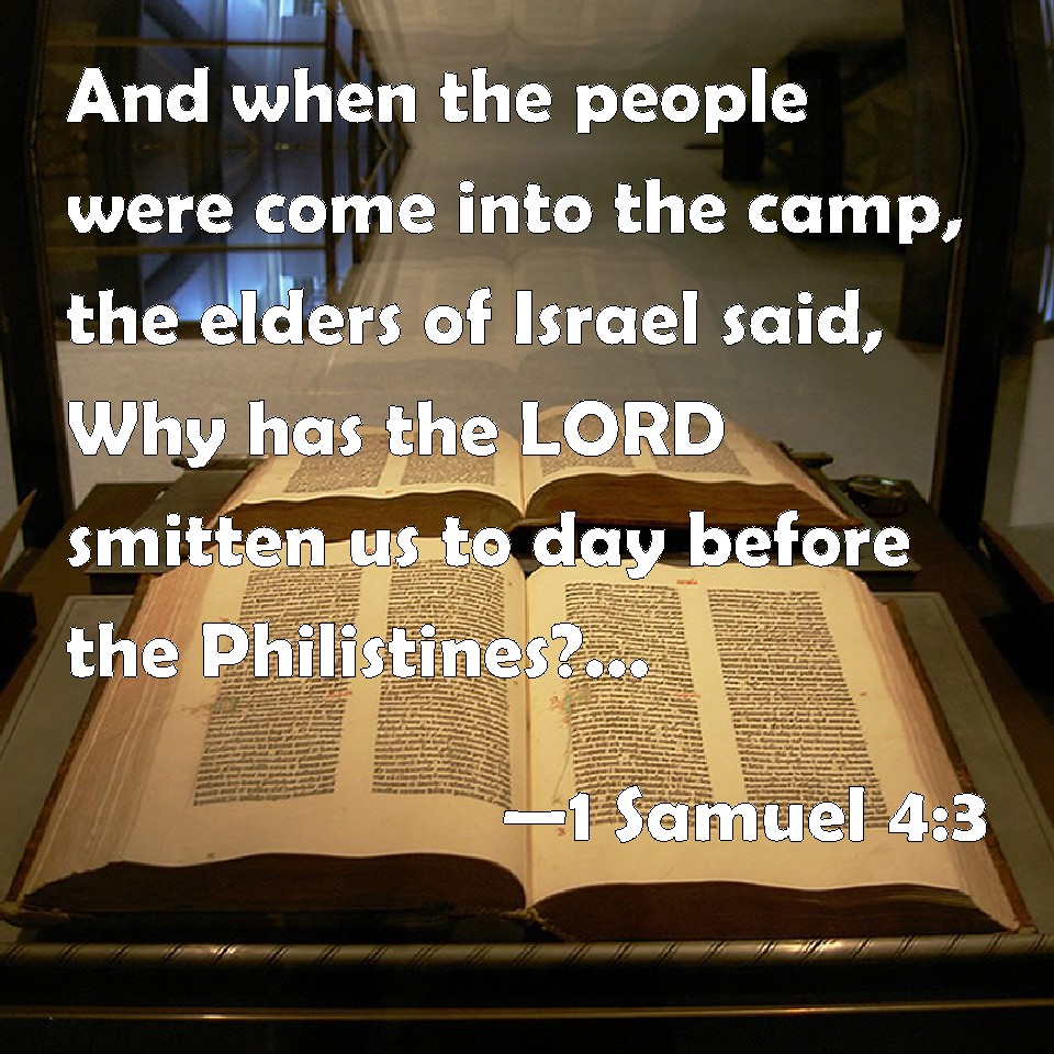 Choose a Background 1 Samuel 4:3 And when the people were come into the camp, the elders of Israel said, Why has the LORD smitten us to day before the Philistines? Let us fetch the ark of the covenant of the LORD out of Shiloh to us, that, when it comes among us, it may save us out of the hand of our enemies. KJV: And when the people were come into the camp, the elders of Israel said, Wherefore hath the LORD smitten us to day before the Philistines? Let us fetch the ark of the covenant of the LORD out of Shiloh unto us, that, when it cometh among us, it may save us out of the hand of our enemies. DRB: And the people returned to the camp: and the ancients of Israel said: Why hath the Lord defeated us to day before the Philistines? Let us fetch unto us the ark of the covenant of the Lord from Silo, and let it come in the midst of us, that it may save us from the hand of our enemies. DBT: And the people came into the camp; and the elders of Israel said, Why has Jehovah smitten us to-day before the Philistines? Let us fetch ourselves the ark of the covenant of Jehovah out of Shiloh, that it may come among us, and save us out of the hand of our enemies. ERV: And when the people were come into the camp, the elders of Israel said, Wherefore hath the LORD smitten us today before the Philistines? Let as fetch the ark of the covenant of the LORD out of Shiloh unto us, that it may come among us, and save us out of the hand of our enemies. WBT: And when the people had come into the camp, the elders of Israel said, Why hath the LORD smitten us to-day before the Philistines? Let us bring the ark of the covenant of the LORD out of Shiloh to us, that when it cometh among us, it may save us from the hand of our enemies. WEB: When the people were come into the camp, the elders of Israel said, "Why has Yahweh struck us today before the Philistines? Let us get the ark of the covenant of Yahweh out of Shiloh to us, that it may come among us, and save us out of the hand of our enemies." YLT: And the people cometh in unto the camp, and the elders of Israel say, 'Why hath Jehovah smitten us to-day before the Philistines? we take unto us from Shiloh the ark of the covenant of Jehovah, and it cometh into our midst, and He doth save us out of the hand of our enemies.'Links 1 Samuel 4:3 NIV • 1 Samuel 4:3 NLT • 1 Samuel 4:3 ESV • 1 Samuel 4:3 NASB • 1 Samuel 4:3 KJV • 1 Samuel 4:3 Interlinear • 1 Samuel 4:3 Commentaries • 1 Samuel 4:3 Parallel Texts • 1 Samuel 4:3 Bible Apps • 1 Samuel 4:3 Parallel • Bible Hub |