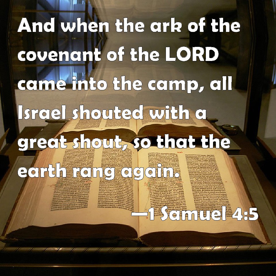 Choose a Background 1 Samuel 4:5 And when the ark of the covenant of the LORD came into the camp, all Israel shouted with a great shout, so that the earth rang again. KJV: And when the ark of the covenant of the LORD came into the camp, all Israel shouted with a great shout, so that the earth rang again. DRB: And when the ark of the covenant of the Lord was come into the camp, all Israel shouted with a great shout, and the earth rang again. DBT: And it came to pass when the ark of the covenant of Jehovah came into the camp, that all Israel shouted with a great shout, so that the earth shook. ERV: And when the ark of the covenant of the LORD came into the camp, all Israel shouted with a great shout, so that the earth rang again. WBT: And when the ark of the covenant of the LORD came into the camp, all Israel shouted with a great shout, so that the earth resounded. WEB: When the ark of the covenant of Yahweh came into the camp, all Israel shouted with a great shout, so that the earth rang again. YLT: And it cometh to pass, at the coming in of the ark of the covenant of Jehovah unto the camp, that all Israel shout — a great shout — and the earth is moved.Links 1 Samuel 4:5 NIV • 1 Samuel 4:5 NLT • 1 Samuel 4:5 ESV • 1 Samuel 4:5 NASB • 1 Samuel 4:5 KJV • 1 Samuel 4:5 Interlinear • 1 Samuel 4:5 Commentaries • 1 Samuel 4:5 Parallel Texts • 1 Samuel 4:5 Bible Apps • 1 Samuel 4:5 Parallel • Bible Hub |