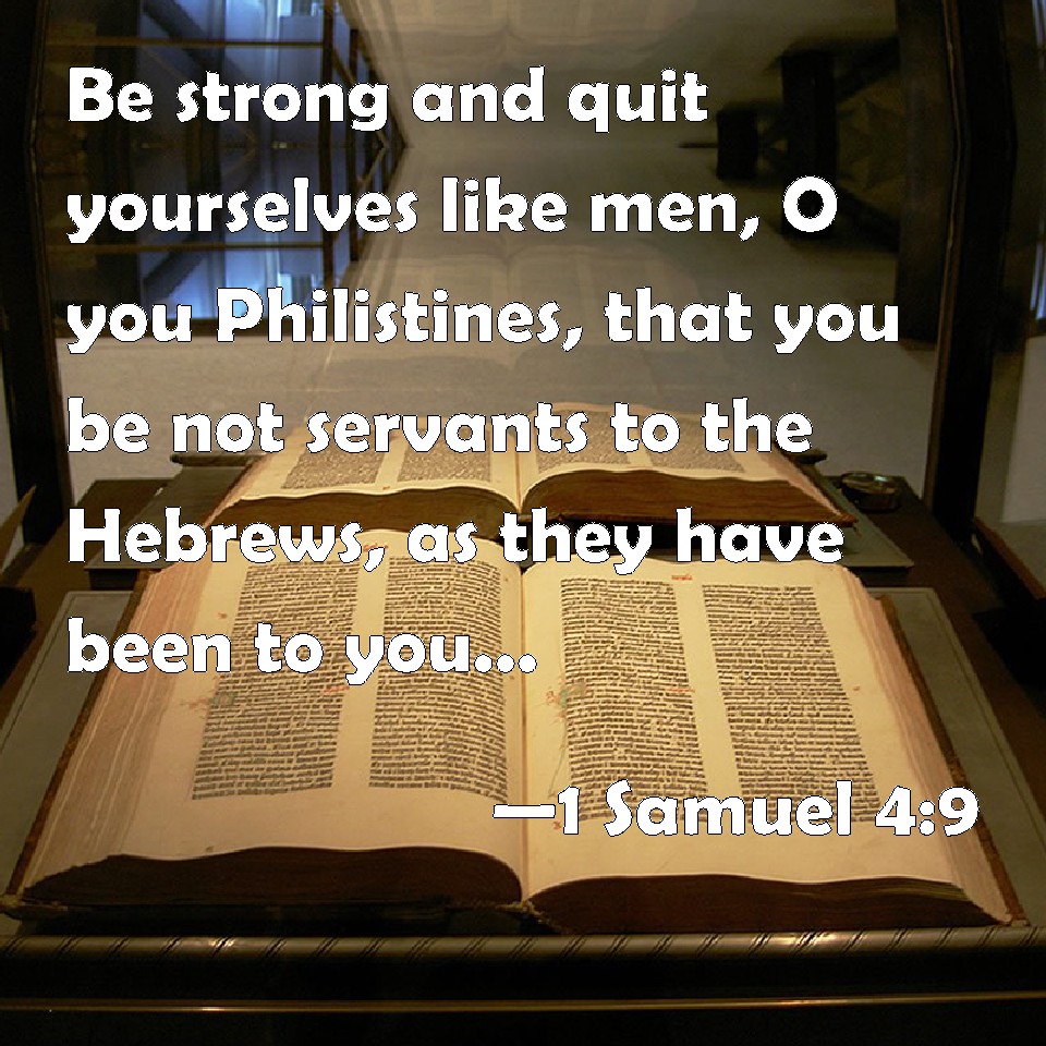 Choose a Background 1 Samuel 4:9 Be strong and quit yourselves like men, O you Philistines, that you be not servants to the Hebrews, as they have been to you: quit yourselves like men, and fight. KJV: Be strong, and quit yourselves like men, O ye Philistines, that ye be not servants unto the Hebrews, as they have been to you: quit yourselves like men, and fight. DRB: Take courage and behave like men, ye Philistines: lest you come to be servants to the Hebrews, as they have served you: take courage and fight. DBT: Shew yourselves valiant and be men, ye Philistines, that ye may not have to be servants to the Hebrews, as they have been servants to you: be men, and fight. ERV: Be strong, and quit yourselves like men, O ye Philistines, that ye be not servants unto the Hebrews, as they have been to you: quit yourselves like men, and fight. WBT: Be strong, and acquit yourselves like men, O ye Philistines, that ye may not be servants to the Hebrews, as they have been to you: acquit yourselves like men, and fight. WEB: Be strong, and behave like men, O you Philistines, that you not be servants to the Hebrews, as they have been to you. Strengthen yourselves like men, and fight!" YLT: Strengthen yourselves, and become men, O Philistines, lest ye do service to Hebrews, as they have done to you — then ye have become men, and have fought.'Links 1 Samuel 4:9 NIV • 1 Samuel 4:9 NLT • 1 Samuel 4:9 ESV • 1 Samuel 4:9 NASB • 1 Samuel 4:9 KJV • 1 Samuel 4:9 Interlinear • 1 Samuel 4:9 Commentaries • 1 Samuel 4:9 Parallel Texts • 1 Samuel 4:9 Bible Apps • 1 Samuel 4:9 Parallel • Bible Hub |