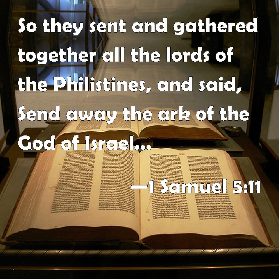 Choose a Background 1 Samuel 5:11 So they sent and gathered together all the lords of the Philistines, and said, Send away the ark of the God of Israel, and let it go again to his own place, that it slay us not, and our people: for there was a deadly destruction throughout all the city; the hand of God was very heavy there. KJV: So they sent and gathered together all the lords of the Philistines, and said, Send away the ark of the God of Israel, and let it go again to his own place, that it slay us not, and our people: for there was a deadly destruction throughout all the city; the hand of God was very heavy there. DRB: They sent therefore and gathered together all the lords of the Philistines: and they said: Send away the ark of the God of Israel, and let it return into its own place, and not kill us and our people. DBT: And they sent and gathered all the lords of the Philistines, and said, Send away the ark of the God of Israel, and let it go again to its own place, that it kill us not, and our people. For there was deadly alarm throughout the city: the hand of God was very heavy there; ERV: They sent therefore and gathered together all the lords of the Philistines, and they said, Send away the ark of the God of Israel, and let it go again to its own place, that it slay us not, and our people: for there was a deadly discomfiture throughout all the city, the hand of God was very heavy there. WBT: So they sent and convened all the lords of the Philistines, and said, Send away the ark of the God of Israel, and let it go again to its own place, that it slay us not, and our people: for there was a deadly destruction throughout all the city; the hand of God was very heavy there. WEB: They sent therefore and gathered together all the lords of the Philistines, and they said, "Send away the ark of the God of Israel, and let it go again to its own place, that it not kill us and our people." For there was a deadly confusion throughout all the city; the hand of God was very heavy there. YLT: And they send and gather all the princes of the Philistines, and say, 'Send away the ark of the God of Israel, and it turneth back to its place, and it doth not put us to death — and our people;' for there hath been a deadly destruction throughout all the city, very heavy hath the hand of God been there,Links 1 Samuel 5:11 NIV • 1 Samuel 5:11 NLT • 1 Samuel 5:11 ESV • 1 Samuel 5:11 NASB • 1 Samuel 5:11 KJV • 1 Samuel 5:11 Interlinear • 1 Samuel 5:11 Commentaries • 1 Samuel 5:11 Parallel Texts • 1 Samuel 5:11 Bible Apps • 1 Samuel 5:11 Parallel • Bible Hub |