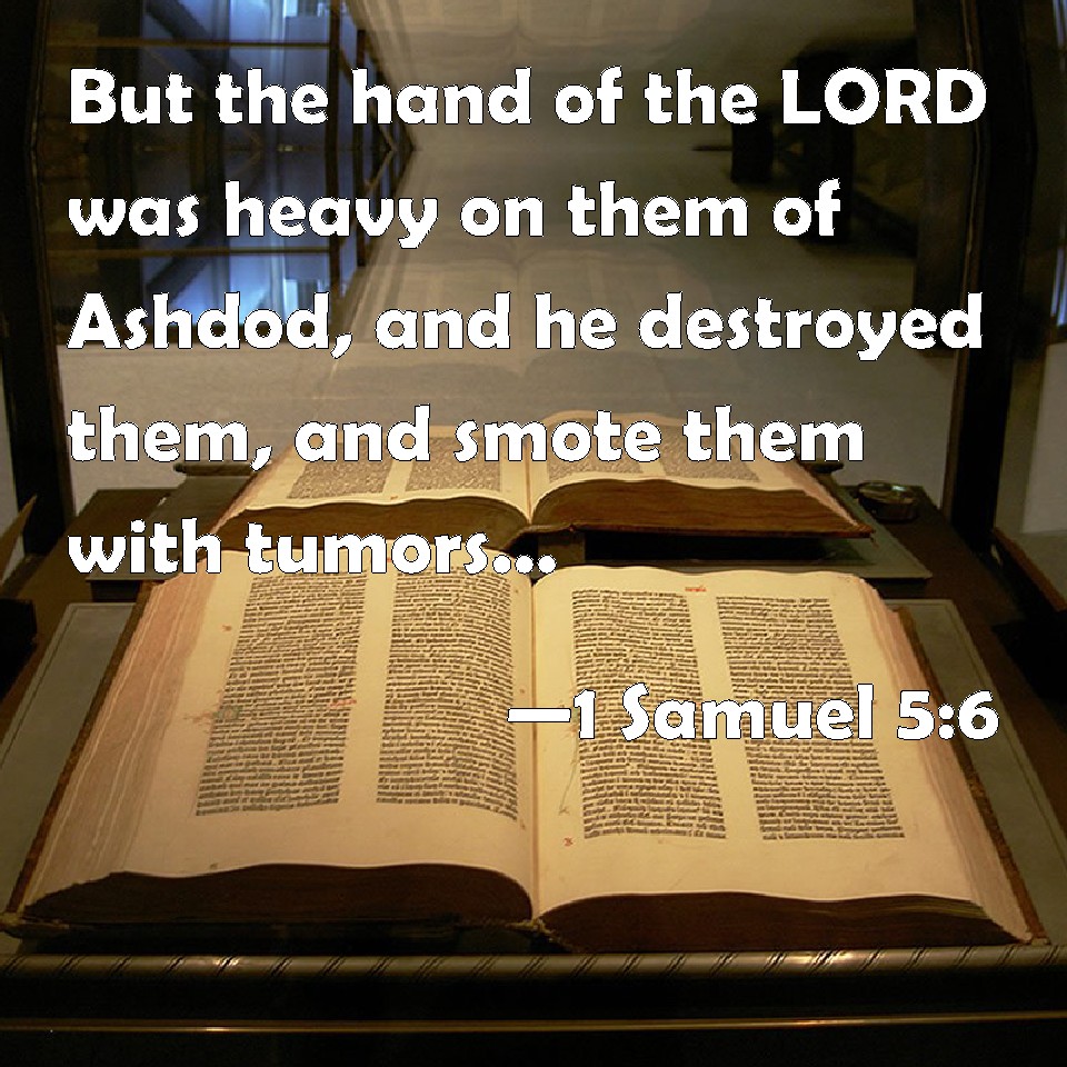 Choose a Background 1 Samuel 5:6 But the hand of the LORD was heavy on them of Ashdod, and he destroyed them, and smote them with tumors, even Ashdod and the coasts thereof. KJV: But the hand of the LORD was heavy upon them of Ashdod, and he destroyed them, and smote them with emerods, even Ashdod and the coasts thereof. DRB: And the hand of the Lord was heavy upon the Azotians, and he destroyed them, and afflicted Azotus and the coasts thereof with emerods. And in the villages and fields in the midst of that country, there came forth a multitude of mice, and there was the confusion of a great mortality in the city. DBT: And the hand of Jehovah was heavy upon them of Ashdod, and he laid them waste, and smote them with hemorrhoids, Ashdod and its borders. ERV: But the hand of the LORD was heavy upon them of Ashdod, and he destroyed them, and smote them with tumours, even Ashdod and the borders thereof. WBT: But the hand of the LORD was heavy upon them of Ashdod, and he destroyed them, and smote them with emerods, even Ashdod, and its borders. WEB: But the hand of Yahweh was heavy on them of Ashdod, and he destroyed them, and struck them with tumors, even Ashdod and its borders. YLT: And the hand of Jehovah is heavy on the Ashdodites, and He maketh them desolate, and smiteth them with emerods, Ashdod and its borders.Links 1 Samuel 5:6 NIV • 1 Samuel 5:6 NLT • 1 Samuel 5:6 ESV • 1 Samuel 5:6 NASB • 1 Samuel 5:6 KJV • 1 Samuel 5:6 Interlinear • 1 Samuel 5:6 Commentaries • 1 Samuel 5:6 Parallel Texts • 1 Samuel 5:6 Bible Apps • 1 Samuel 5:6 Parallel • Bible Hub |
