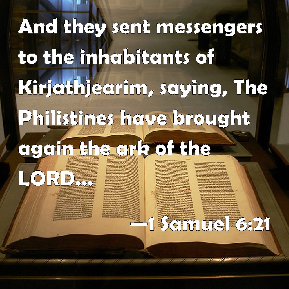 Choose a Background 1 Samuel 6:21 And they sent messengers to the inhabitants of Kirjathjearim, saying, The Philistines have brought again the ark of the LORD; come you down, and fetch it up to you. KJV: And they sent messengers to the inhabitants of Kirjathjearim, saying, The Philistines have brought again the ark of the LORD; come ye down, and fetch it up to you. DRB: And they sent messengers to the inhabitants of Cariathiarim, saying: The Philistines have brought back the ark of the Lord, come ye down and fetch it up to you. DBT: And they sent messengers to the inhabitants of Kirjath-jearim, saying, The Philistines have brought again the ark of Jehovah; come down, fetch it up to you. ERV: And they sent messengers to the inhabitants of Kiriath-jearim, saying, The Philistines have brought again the ark of the LORD; come ye down, and fetch it up to you. WBT: And they sent messengers to the inhabitants of Kirjath-jearim, saying, The Philistines have brought again the ark of the LORD; come ye down, and bring it up to you. WEB: They sent messengers to the inhabitants of Kiriath Jearim, saying, "The Philistines have brought back the ark of Yahweh; come down, and bring it up to yourselves." YLT: And they send messengers unto the inhabitants of Kirjath-Jearim, saying, 'The Philistines have sent back the ark of Jehovah; come down, take it up unto you.'Links 1 Samuel 6:21 NIV • 1 Samuel 6:21 NLT • 1 Samuel 6:21 ESV • 1 Samuel 6:21 NASB • 1 Samuel 6:21 KJV • 1 Samuel 6:21 Interlinear • 1 Samuel 6:21 Commentaries • 1 Samuel 6:21 Parallel Texts • 1 Samuel 6:21 Bible Apps • 1 Samuel 6:21 Parallel • Bible Hub |