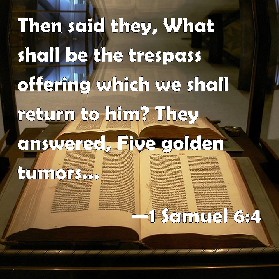 Choose a Background 1 Samuel 6:4 Then said they, What shall be the trespass offering which we shall return to him? They answered, Five golden tumors, and five golden mice, according to the number of the lords of the Philistines: for one plague was on you all, and on your lords. KJV: Then said they, What shall be the trespass offering which we shall return to him? They answered, Five golden emerods, and five golden mice, according to the number of the lords of the Philistines: for one plague was on you all, and on your lords. DRB: They answered: What is it we ought to render unto him for sin? and they answered: DBT: Then they said, What is the trespass-offering which we shall return to him? And they said, Five golden hemorrhoids, and five golden mice, the number of the lords of the Philistines; for one plague is upon them all, and upon your lords. ERV: Then said they, What shall be the guilt offering which we shall return to him? And they said, Five golden tumours, and five golden mice, according to the number of the lords of the Philistines: for one plague was on you all, and on your lords. WBT: Then said they, What shall be the trespass-offering which we shall return to him? They answered, Five golden emerods, and five golden mice, according to the number of the lords of the Philistines: for one plague was on you all, and on your lords. WEB: Then they said, "What shall be the trespass offering which we shall return to him?" They said, "Five golden tumors, and five golden mice, [according to] the number of the lords of the Philistines; for one plague was on you all, and on your lords. YLT: And they say, 'What is the guilt-offering which we send back to Him?' and they say, 'The number of the princes of the Philistines — five golden emerods, and five golden mice — for one plague is to you all, and to your princes,Links 1 Samuel 6:4 NIV • 1 Samuel 6:4 NLT • 1 Samuel 6:4 ESV • 1 Samuel 6:4 NASB • 1 Samuel 6:4 KJV • 1 Samuel 6:4 Interlinear • 1 Samuel 6:4 Commentaries • 1 Samuel 6:4 Parallel Texts • 1 Samuel 6:4 Bible Apps • 1 Samuel 6:4 Parallel • Bible Hub |