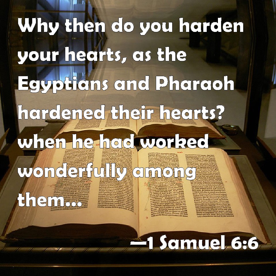 Choose a Background 1 Samuel 6:6 Why then do you harden your hearts, as the Egyptians and Pharaoh hardened their hearts? when he had worked wonderfully among them, did they not let the people go, and they departed? KJV: Wherefore then do ye harden your hearts, as the Egyptians and Pharaoh hardened their hearts? when he had wrought wonderfully among them, did they not let the people go, and they departed? DRB: Why do you harden your hearts, as Egypt and Pharao hardened their hearts? did not he, after he was struck, then let them go, and they departed? DBT: And why will ye harden your heart, as the Egyptians and Pharaoh hardened their heart? When he had wrought mightily among them, did they not let them go, and they departed? ERV: Wherefore then do ye harden your hearts, as the Egyptians and Pharaoh hardened their hearts? when he had wrought wonderfully among them, did they not let the people go and they departed? WBT: Why then do ye harden your hearts, as the Egyptians and Pharaoh hardened their hearts? when he had wrought wonderfully among them, did they not let the people go, and they departed? WEB: Why then do you harden your hearts, as the Egyptians and Pharaoh hardened their hearts? When he had worked wonderfully among them, didn't they let the people go, and they departed? YLT: and why do ye harden your heart as the Egyptians and Pharaoh hardened their heart? do they not — when He hath rolled Himself upon them — send them away, and they go?Links 1 Samuel 6:6 NIV • 1 Samuel 6:6 NLT • 1 Samuel 6:6 ESV • 1 Samuel 6:6 NASB • 1 Samuel 6:6 KJV • 1 Samuel 6:6 Interlinear • 1 Samuel 6:6 Commentaries • 1 Samuel 6:6 Parallel Texts • 1 Samuel 6:6 Bible Apps • 1 Samuel 6:6 Parallel • Bible Hub |