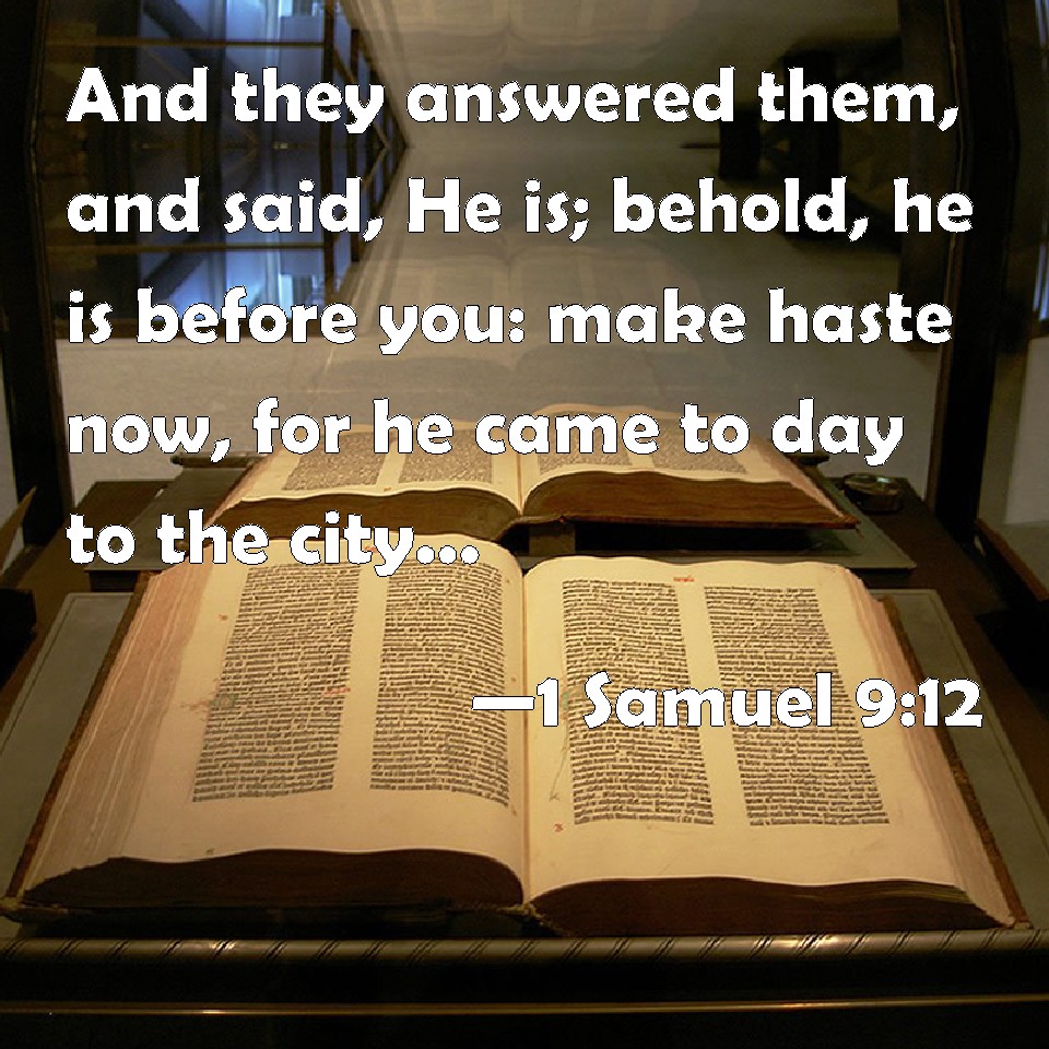 Choose a Background 1 Samuel 9:12 And they answered them, and said, He is; behold, he is before you: make haste now, for he came to day to the city; for there is a sacrifice of the people to day in the high place: KJV: And they answered them, and said, He is; behold, he is before you: make haste now, for he came to day to the city; for there is a sacrifice of the people to day in the high place: DRB: They answered and said to them: He is: behold he is before you, make haste now: for he came to day into the city, for there is a sacrifice of the people to day in the high place. DBT: And they answered them and said, He is; behold, he is before thee: make haste now, for he came to-day to the city; for the people have a sacrifice to-day in the high place. ERV: And they answered them, and said, He is; behold, he is before thee: make haste now, for he is come today into the city; for the people have a sacrifice today in the high place: WBT: And they answered them, and said, He is; behold, he is before you: make haste now, for he came to-day to the city; for there is a sacrifice of the people to-day in the high place: WEB: They answered them, and said, "He is. Behold, he is before you. Hurry now, for he has come today into the city; for the people have a sacrifice today in the high place. YLT: And they answer them and say, 'He is; lo, before thee! haste, now, for to-day he hath come in to the city, for the people hath a stated sacrifice in a high place.Links 1 Samuel 9:12 NIV • 1 Samuel 9:12 NLT • 1 Samuel 9:12 ESV • 1 Samuel 9:12 NASB • 1 Samuel 9:12 KJV • 1 Samuel 9:12 Interlinear • 1 Samuel 9:12 Commentaries • 1 Samuel 9:12 Parallel Texts • 1 Samuel 9:12 Bible Apps • 1 Samuel 9:12 Parallel • Bible Hub |
