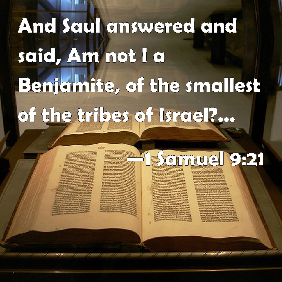 Choose a Background 1 Samuel 9:21 And Saul answered and said, Am not I a Benjamite, of the smallest of the tribes of Israel? and my family the least of all the families of the tribe of Benjamin? why then speak you so to me? KJV: And Saul answered and said, Am not I a Benjamite, of the smallest of the tribes of Israel? and my family the least of all the families of the tribe of Benjamin? wherefore then speakest thou so to me? DRB: And Saul answering, said: Am not I a son of Jemini of the least tribe of Israel, and my kindred the last among all the families of the tribe of Benjamin? Why then hast thou spoken this word to me? DBT: And Saul answered and said, Am not I a Benjaminite, of the smallest of the tribes of Israel, and my family the least of all the families of the tribe of Benjamin? and why dost thou speak such words to me? ERV: And Saul answered and said, Am not I a Benjamite, of the smallest of the tribes of Israel? and my family the least of all the families of the tribe of Benjamin? wherefore then speakest thou to me after this manner? WBT: And Saul answered and said, Am not I a Benjaminite, of the smallest of the tribes of Israel? and my family the least of all the families of the tribe of Benjamin? Why then speakest thou so to me? WEB: Saul answered, "Am I not a Benjamite, of the smallest of the tribes of Israel? And my family the least of all the families of the tribe of Benjamin? Why then do you speak to me like this?" YLT: And Saul answereth and saith, 'Am not I a Benjamite — of the smallest of the tribes of Israel? and my family the least of all the families of the tribe of Benjamin? and why hast thou spoken unto me according to this word?'Links 1 Samuel 9:21 NIV • 1 Samuel 9:21 NLT • 1 Samuel 9:21 ESV • 1 Samuel 9:21 NASB • 1 Samuel 9:21 KJV • 1 Samuel 9:21 Interlinear • 1 Samuel 9:21 Commentaries • 1 Samuel 9:21 Parallel Texts • 1 Samuel 9:21 Bible Apps • 1 Samuel 9:21 Parallel • Bible Hub |