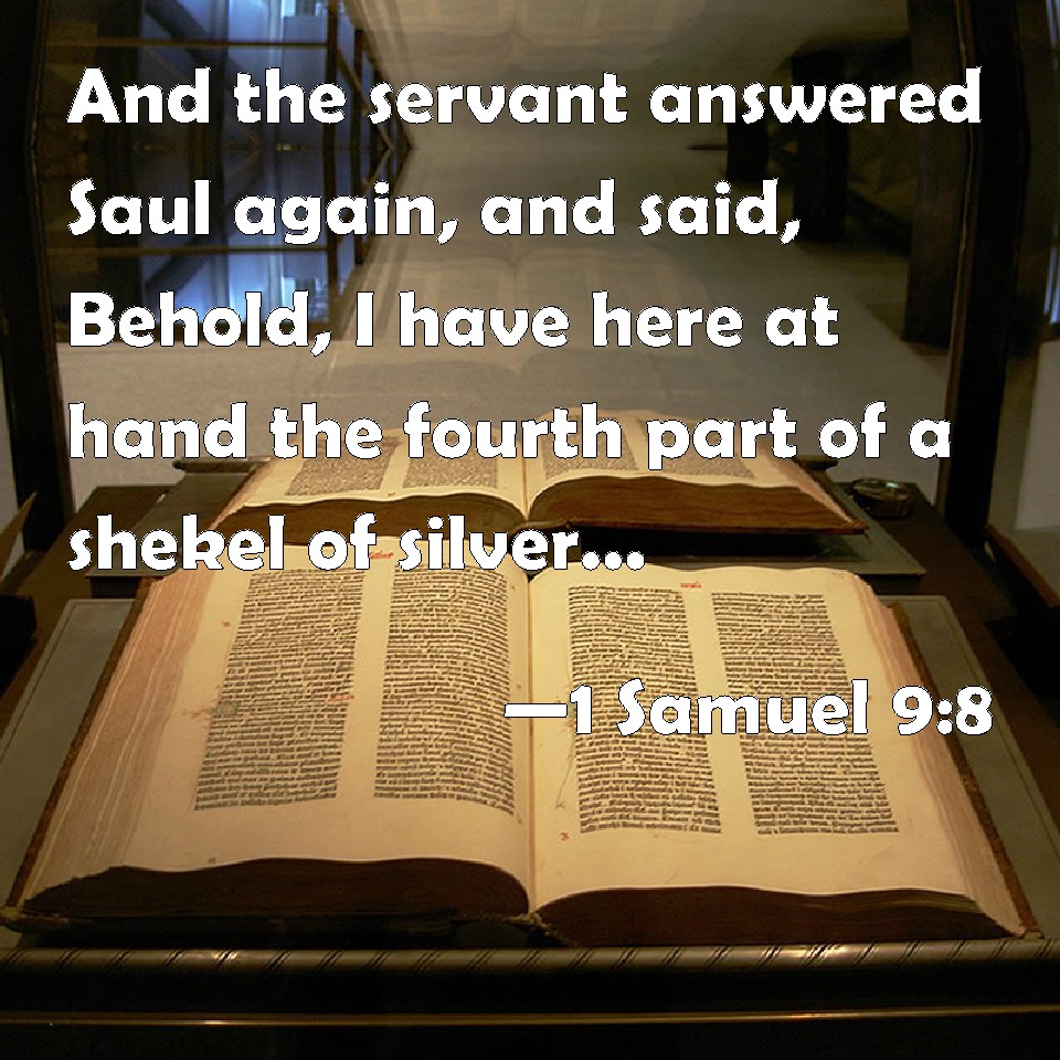 Choose a Background 1 Samuel 9:8 And the servant answered Saul again, and said, Behold, I have here at hand the fourth part of a shekel of silver: that will I give to the man of God, to tell us our way. KJV: And the servant answered Saul again, and said, Behold, I have here at hand the fourth part of a shekel of silver: that will I give to the man of God, to tell us our way. DRB: The servant answered Saul again, and said: Behold there is found in my hand the fourth part of a sicle of silver, let us give it to the man of God, that he may tell us our way. DBT: And the servant answered Saul again and said, Behold, I have here at hand the fourth part of a shekel of silver; that will I give to the man of God, to tell us our way. ERV: And the servant answered Saul again, and said, Beheld, I have in my hand the fourth part of a shekel of silver: that will I give to the man of God, to tell us our way. WBT: And the servant answered Saul again, and said, Behold, I have here at hand the fourth part of a shekel of silver: that will I give to the man of God, to tell us our way. WEB: The servant answered Saul again, and said, "Behold, I have in my hand the fourth part of a shekel of silver. I will give that to the man of God, to tell us our way." YLT: And the young man addeth to answer Saul, and saith, 'Lo, there is found with me a fourth of a shekel of silver: and I have given to the man of God, and he hath declared to us our way.'Links 1 Samuel 9:8 NIV • 1 Samuel 9:8 NLT • 1 Samuel 9:8 ESV • 1 Samuel 9:8 NASB • 1 Samuel 9:8 KJV • 1 Samuel 9:8 Interlinear • 1 Samuel 9:8 Commentaries • 1 Samuel 9:8 Parallel Texts • 1 Samuel 9:8 Bible Apps • 1 Samuel 9:8 Parallel • Bible Hub |