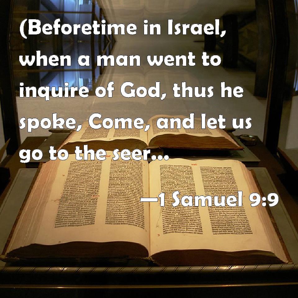 Choose a Background 1 Samuel 9:9 (Beforetime in Israel, when a man went to inquire of God, thus he spoke, Come, and let us go to the seer: for he that is now called a Prophet was beforetime called a Seer.) KJV: (Beforetime in Israel, when a man went to inquire of God, thus he spake, Come, and let us go to the seer: for he that is now called a Prophet was beforetime called a Seer.) DRB: Now in time past, in Israel when a man went to consult God he spoke thus: Come, let us go to the seer. For he that is now called a prophet, in time past was called a seer. DBT: (In former time in Israel, when a man went to ask counsel of God, he said, Come and let us go to the seer; for he that is now called a Prophet was in former time called a Seer.) ERV: (Beforetime in Israel, when a man went to inquire of God, thus he said, Come and let us go to the seer: for he that is now called a Prophet was beforetime called a Seer.) WBT: (Formerly in Israel, when a man went to inquire of God, thus he spoke, Come, and let us go to the seer: for he that is now called a Prophet was formerly called a Seer.) WEB: (In earlier times in Israel, when a man went to inquire of God, thus he said, "Come, and let us go to the seer;" for he who is now called a prophet was before called a Seer.) YLT: Formerly in Israel, thus said the man in his going to seek God, 'Come and we go unto the seer,' for the 'prophet' of to-day is called formerly 'the seer.'Links 1 Samuel 9:9 NIV • 1 Samuel 9:9 NLT • 1 Samuel 9:9 ESV • 1 Samuel 9:9 NASB • 1 Samuel 9:9 KJV • 1 Samuel 9:9 Interlinear • 1 Samuel 9:9 Commentaries • 1 Samuel 9:9 Parallel Texts • 1 Samuel 9:9 Bible Apps • 1 Samuel 9:9 Parallel • Bible Hub |