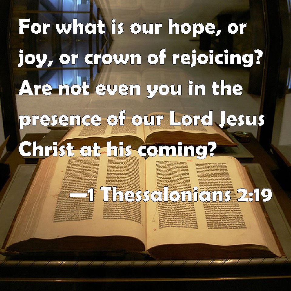 Choose a Background 1 Thessalonians 2:19 For what is our hope, or joy, or crown of rejoicing? Are not even you in the presence of our Lord Jesus Christ at his coming? KJV: For what is our hope, or joy, or crown of rejoicing? Are not even ye in the presence of our Lord Jesus Christ at his coming? DRB: For what is our hope, or joy, or crown of glory? Are not you, in the presence of our Lord Jesus Christ at his coming? DBT: For what is our hope, or joy, or crown of boasting? are not ye also before our Lord Jesus at his coming? ERV: For what is our hope, or joy, or crown of glorying? Are not even ye, before our Lord Jesus at his coming? WBT: For what is our hope, or joy, or crown of rejoicing? Are not even ye in the presence of our Lord Jesus Christ at his coming? WEB: For what is our hope, or joy, or crown of rejoicing? Isn't it even you, before our Lord Jesus at his coming? YLT: for what is our hope, or joy, or crown of rejoicing? are not even ye before our Lord Jesus Christ in his presence?Links 1 Thessalonians 2:19 NIV • 1 Thessalonians 2:19 NLT • 1 Thessalonians 2:19 ESV • 1 Thessalonians 2:19 NASB • 1 Thessalonians 2:19 KJV • 1 Thessalonians 2:19 Interlinear • 1 Thessalonians 2:19 Commentaries • 1 Thessalonians 2:19 Parallel Texts • 1 Thessalonians 2:19 Bible Apps • 1 Thessalonians 2:19 Parallel • Bible Hub |