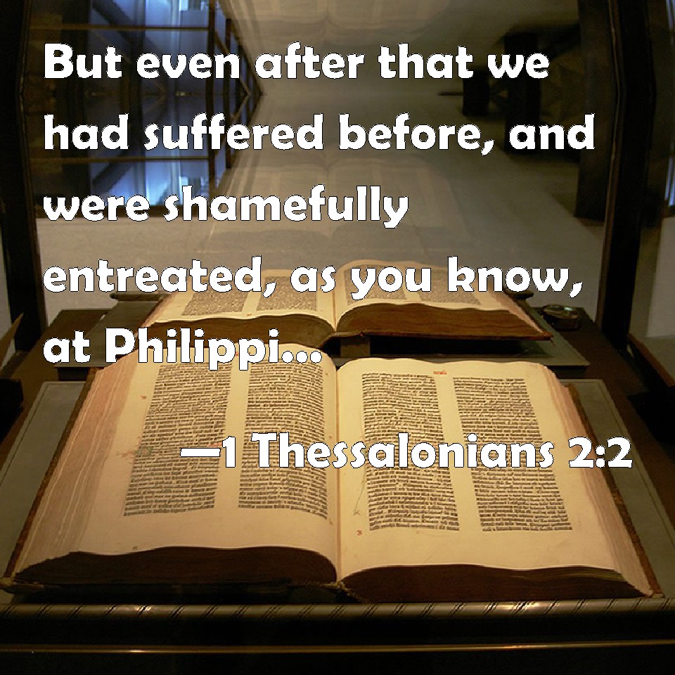 Choose a Background 1 Thessalonians 2:2 But even after that we had suffered before, and were shamefully entreated, as you know, at Philippi, we were bold in our God to speak to you the gospel of God with much contention. KJV: But even after that we had suffered before, and were shamefully entreated, as ye know, at Philippi, we were bold in our God to speak unto you the gospel of God with much contention. DRB: But having suffered many things before, and been shamefully treated (as you know) at Philippi, we had confidence in our God, to speak unto you the gospel of God in much carefulness. DBT: but, having suffered before and been insulted, even as ye know, in Philippi, we were bold in our God to speak unto you the glad tidings of God with much earnest striving. ERV: but having suffered before, and been shamefully entreated, as ye know, at Philippi, we waxed bold in our God to speak unto you the gospel of God in much conflict. WBT: But even after we had suffered before, and were shamefully treated, as ye know, at Phillippi, we were bold in our God to speak to you the gospel of God with much contention. WEB: but having suffered before and been shamefully treated, as you know, at Philippi, we grew bold in our God to tell you the Good News of God in much conflict. YLT: but having both suffered before, and having been injuriously treated (as ye have known) in Philippi, we were bold in our God to speak unto you the good news of God in much conflict,Links 1 Thessalonians 2:2 NIV • 1 Thessalonians 2:2 NLT • 1 Thessalonians 2:2 ESV • 1 Thessalonians 2:2 NASB • 1 Thessalonians 2:2 KJV • 1 Thessalonians 2:2 Interlinear • 1 Thessalonians 2:2 Commentaries • 1 Thessalonians 2:2 Parallel Texts • 1 Thessalonians 2:2 Bible Apps • 1 Thessalonians 2:2 Parallel • Bible Hub |