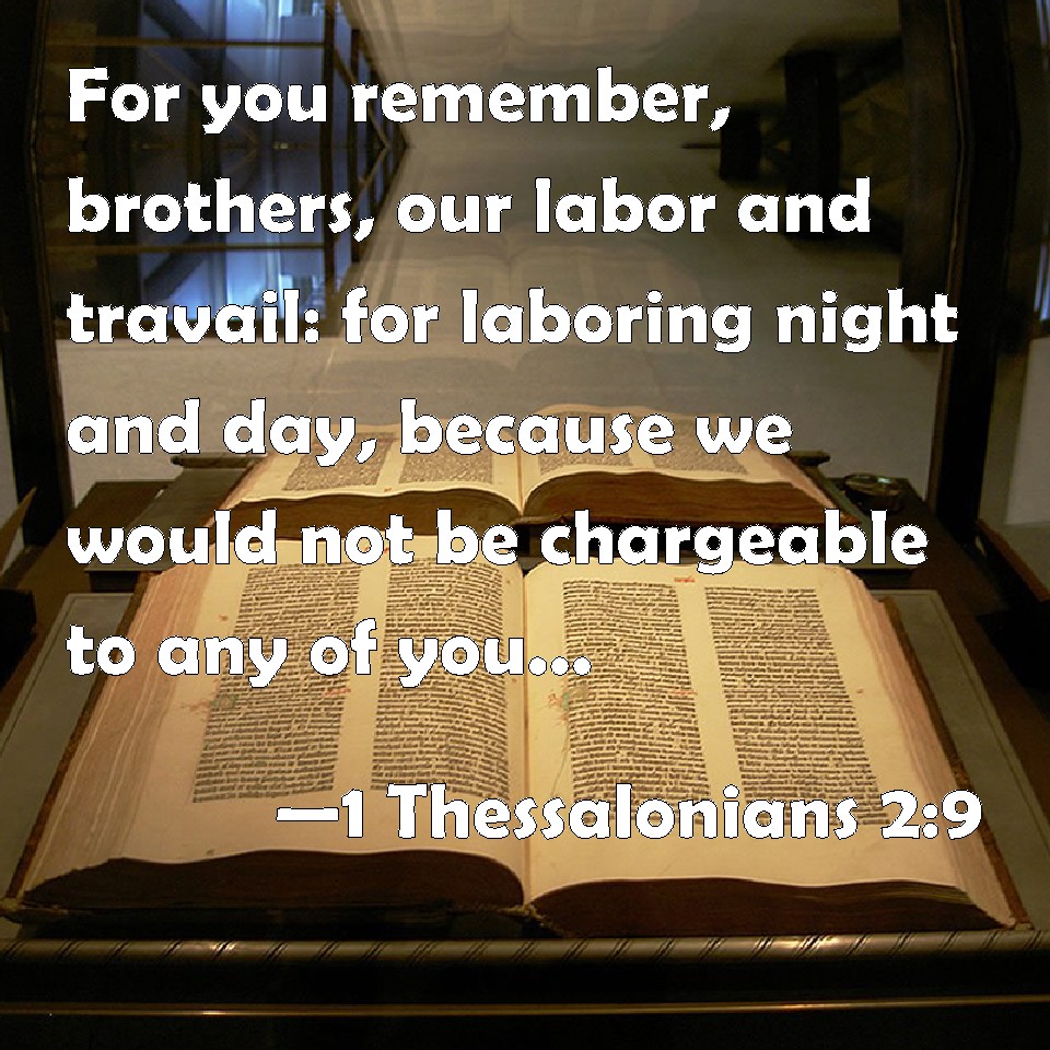 Choose a Background 1 Thessalonians 2:9 For you remember, brothers, our labor and travail: for laboring night and day, because we would not be chargeable to any of you, we preached to you the gospel of God. KJV: For ye remember, brethren, our labour and travail: for labouring night and day, because we would not be chargeable unto any of you, we preached unto you the gospel of God. DRB: For you remember, brethren, our labour and toil: working night and day, lest we should be chargeable to any of you, we preached among you the gospel of God. DBT: For ye remember, brethren, our labour and toil: working night and day, not to be chargeable to any one of you, we have preached to you the glad tidings of God. ERV: For ye remember, brethren, our labour and travail: working night and day, that we might not burden any of you, we preached unto you the gospel of God. WBT: For ye remember, brethren, our labor and toil: for laboring night and day, because we would not be chargeable to any of you, we preached to you the gospel of God. WEB: For you remember, brothers, our labor and travail; for working night and day, that we might not burden any of you, we preached to you the Good News of God. YLT: for ye remember, brethren, our labour and travail, for, night and day working not to be a burden upon any of you, we did preach to you the good news of God;Links 1 Thessalonians 2:9 NIV • 1 Thessalonians 2:9 NLT • 1 Thessalonians 2:9 ESV • 1 Thessalonians 2:9 NASB • 1 Thessalonians 2:9 KJV • 1 Thessalonians 2:9 Interlinear • 1 Thessalonians 2:9 Commentaries • 1 Thessalonians 2:9 Parallel Texts • 1 Thessalonians 2:9 Bible Apps • 1 Thessalonians 2:9 Parallel • Bible Hub |